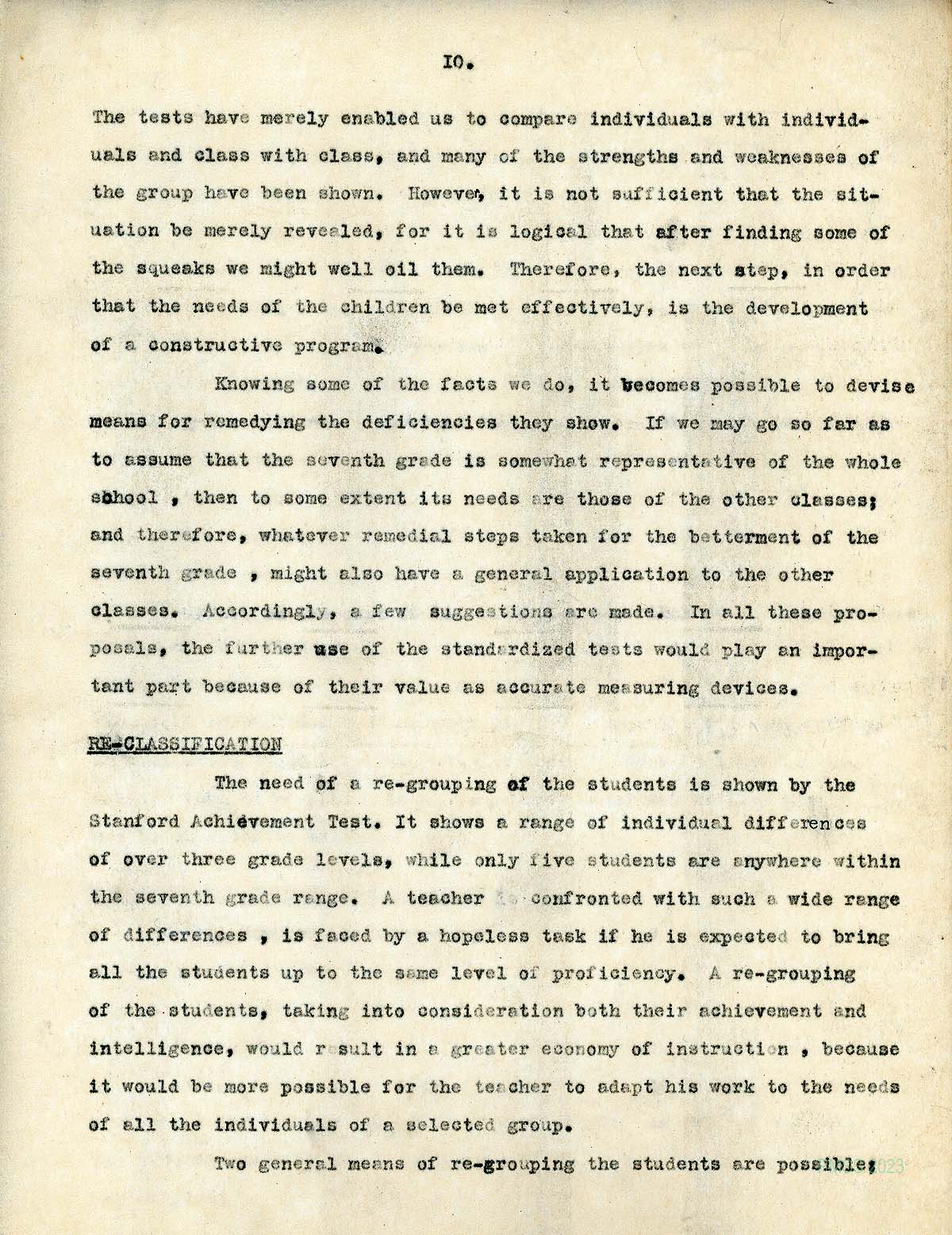 …eliminate a very great share of the present low class standings and the present wide range of individual differences within classes.