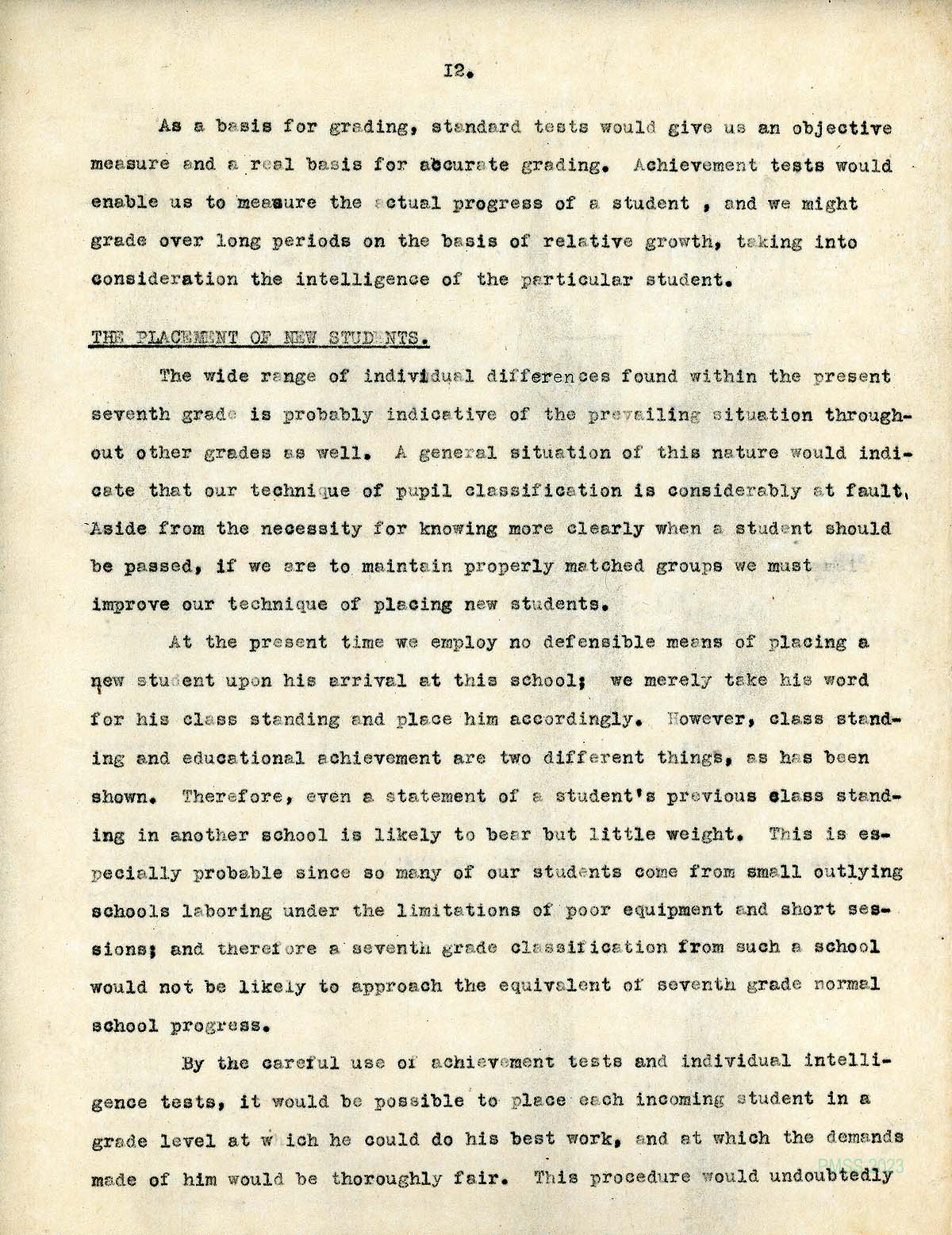 By the careful use of achievement tests and individual intelligence tests, it would be possible to place each incoming student in a grade level at which he could do his best work, and at which the demands made of him would be thoroughly fair. This procedure would undoubtedly…