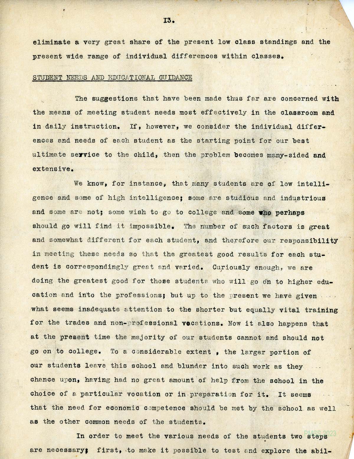 We know, for instance, that many students are of low intelligence and some of high intelligence; some are studious and industrious and some are not; some wish to go to college and some who perhaps should go will find it impossible. The number of such factors is great and somewhat different for each student, and therefore our responsibility in meeting these needs so that the greatest good results for each student is correspondingly great and varied. Curiously enough, we are doing the greatest good for those students who will go on to higher education and into the professions; but up to the present we have given what seems inadequate attention to the shorter but equally vital training for the trades and non-professional vocations. Now it also happens that at the present time the majority of our students cannot and should not go on to college. To a considerable extent the larger portion of our students leave this school and blunder into such work as they chance upon, having had no great amount of help from the school in the choice of a particular vocation or in preparation for it. It seems that the need for economic competence should be met by the school as well as the other common needs of the students.