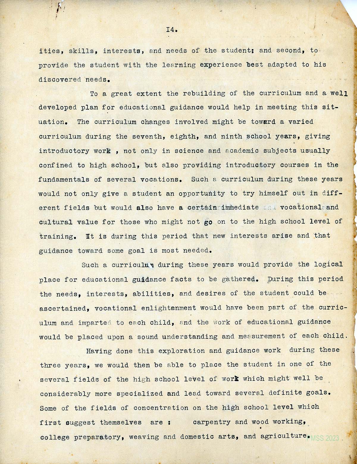 Such a curriculum during these years would provide the logical place for educational guidance facts to be gathered. During this period the needs, interests, abilities, and desires of the student could be ascertained, vocational enlightenment would have been part of the curriculum and imparted to each child, and the work of educational guidance would be placed upon a sound understanding and measurement of each child. Having done this exploration and guidance work during these three years, we would then be able to place the student in one of the several fields of the high school level of work which might well be considerably more specialized and lead toward several definite goals. Some of the fields of concentration on the high school level which first suggest themselves are: carpentry and wood working, college preparatory, weaving and domestic arts, and agriculture.