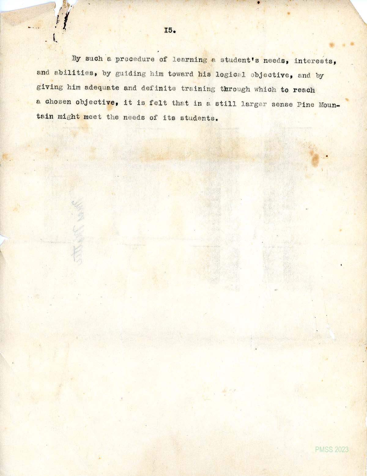 By such a procedure of learning a student’s needs, interests, and abilities, by guiding him toward his logical objective, and by giving him adequate and definite training through which to reach a chosen objective, it is felt that in a still larger sense Pine Mountain might meet the needs of its students.