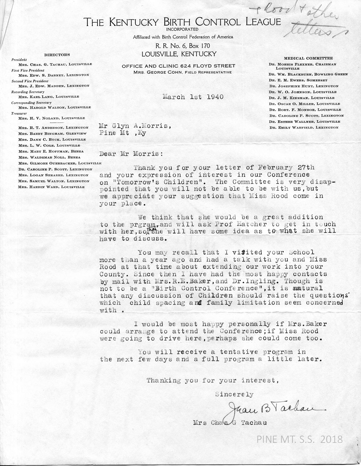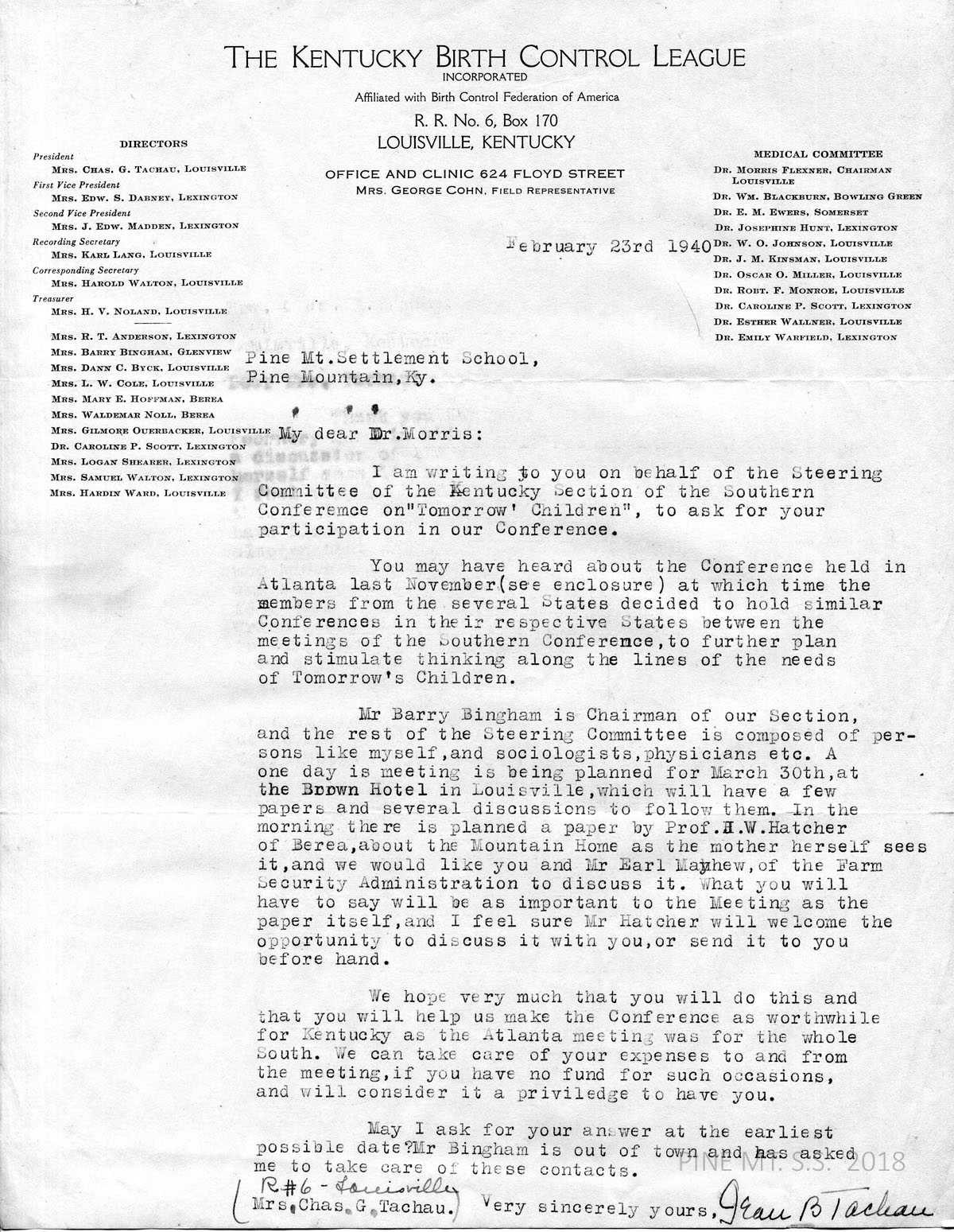 Feb. 23, 1940 – Jean B. Tachau (President, The Kentucky Birth Control League, Louisville, KY) to Glyn Morris.