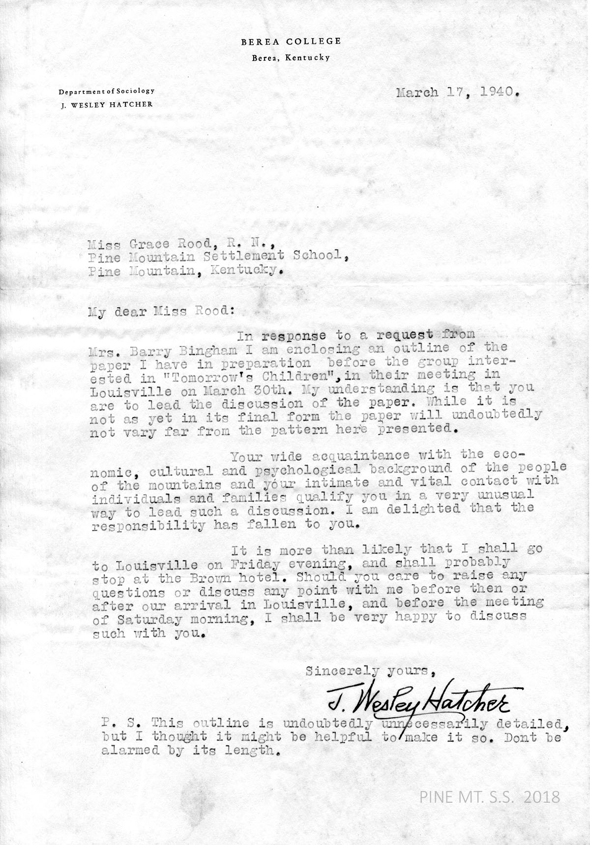 Hatcher sent Rood an outline of the paper on “Tomorrow’s Children,” that he will present at the March 30th Conference. “Your wide acquaintance with the economic, cultural and psychological background of the people of the mountains and your intimate and vital contact with individuals and families qualify you in a very unusual way to lead such a discussion.”