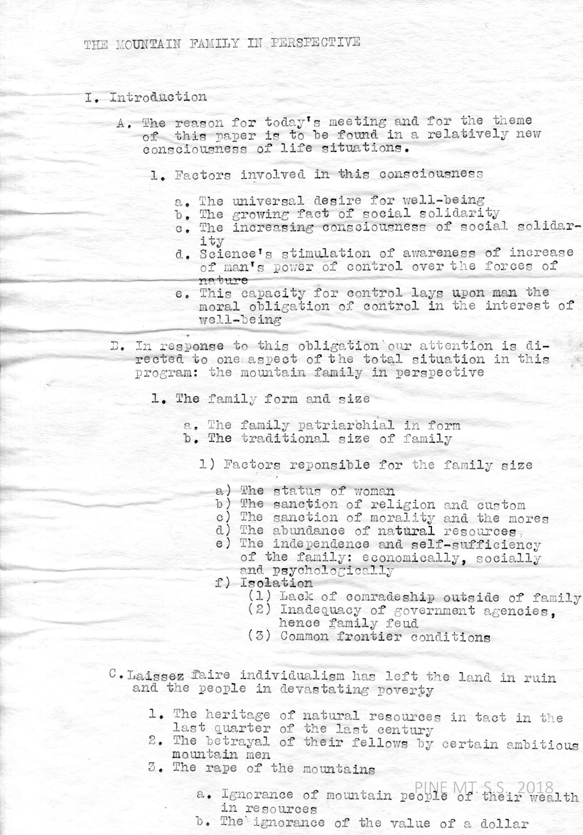 Outline of Hatcher’s paper, “The Mountain Family in Perspective,” pages 1 and 2.