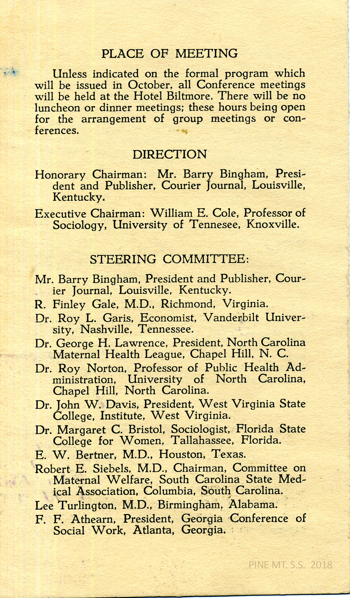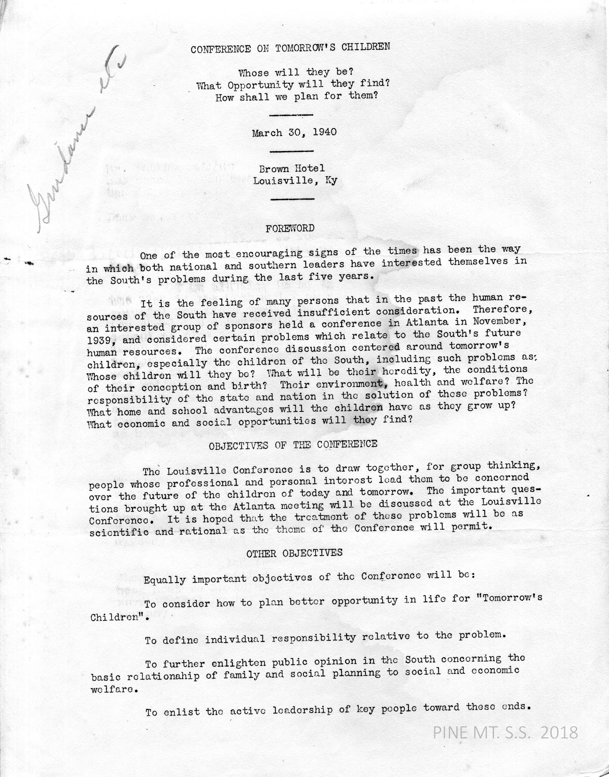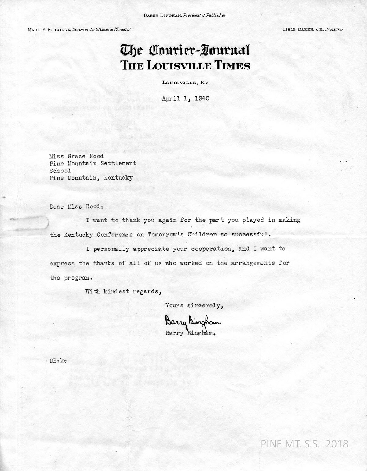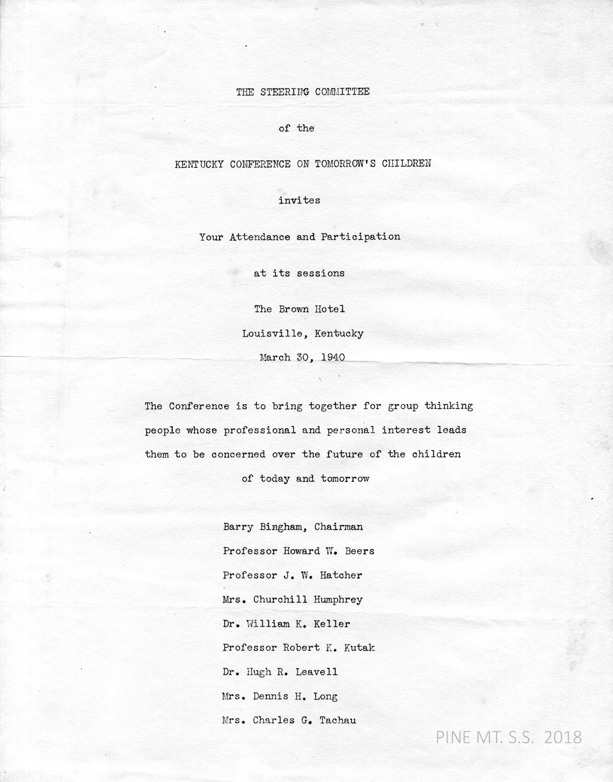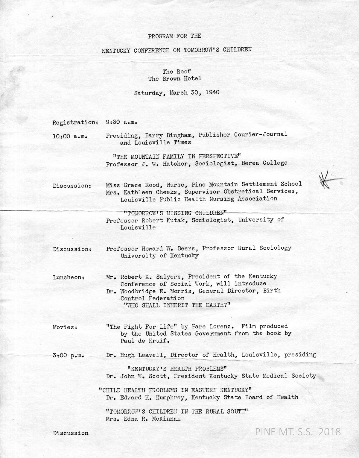 In November of 1939 the Conference on “To-morrow’s Children” in Atlanta, GA, inspired many and resulted in a Kentucky Conference on the same theme. Barry Bingham, of the Louisville Courier Journal, and a member of the Pine Mountain Board of Trustees, served as Chairman of the Kentucky efforts. He brought together thinking people from throughout Kentucky. Grace Rood was one of those invited to lead a discussion group based on “The Mountain Family in Perspective, ” and “Tomorrow’s Missing Children.”The conference asked specifically about the health of mountain children but addressed the health of children state-wide. Berea College and Dr. Francis and Mrs. Hutchins were sp0onsors of the conference.
