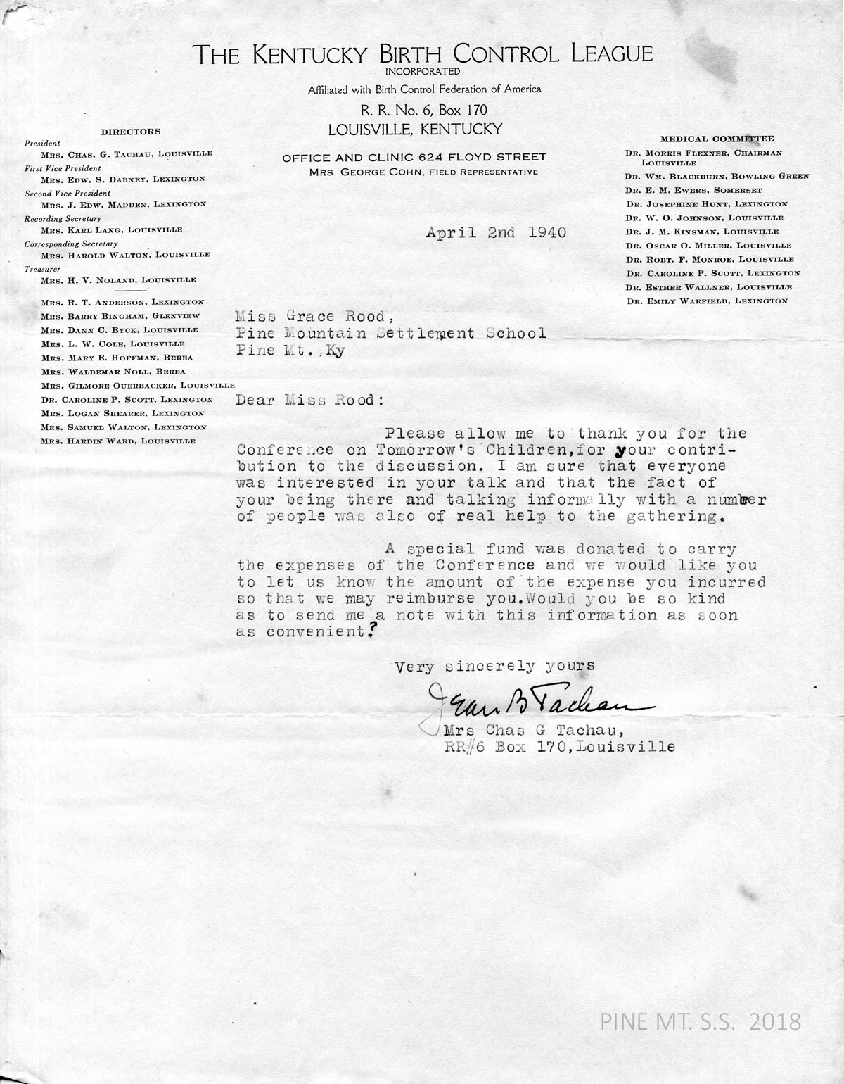 Jean B. Tachau, President, The Kentucky Birth Control League, Louisville, KY, to Miss Rood, thanking Rood for her “contribution to the discussion at the Conference on Tomorrow’s Children.
