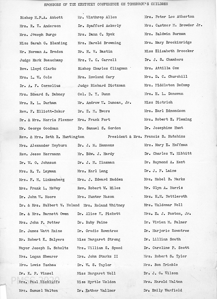 Introduction, agenda, and program for the Kentucky Branch of Conference on Tomorrow’s Children on March 30, 1940, at Brown Hotel, Louisville, Ky. Included is a list of sponsors.