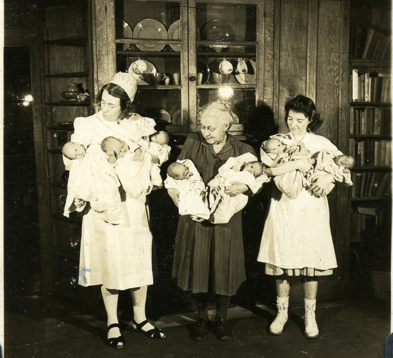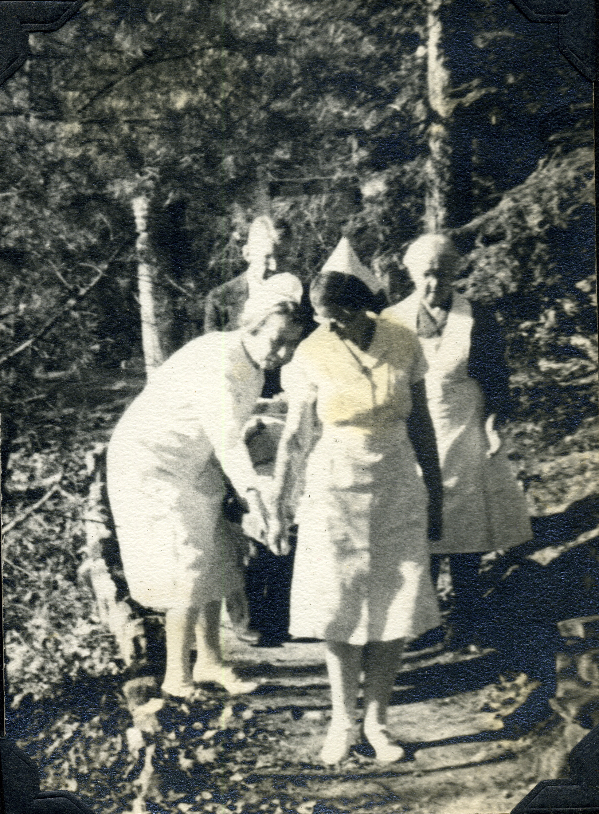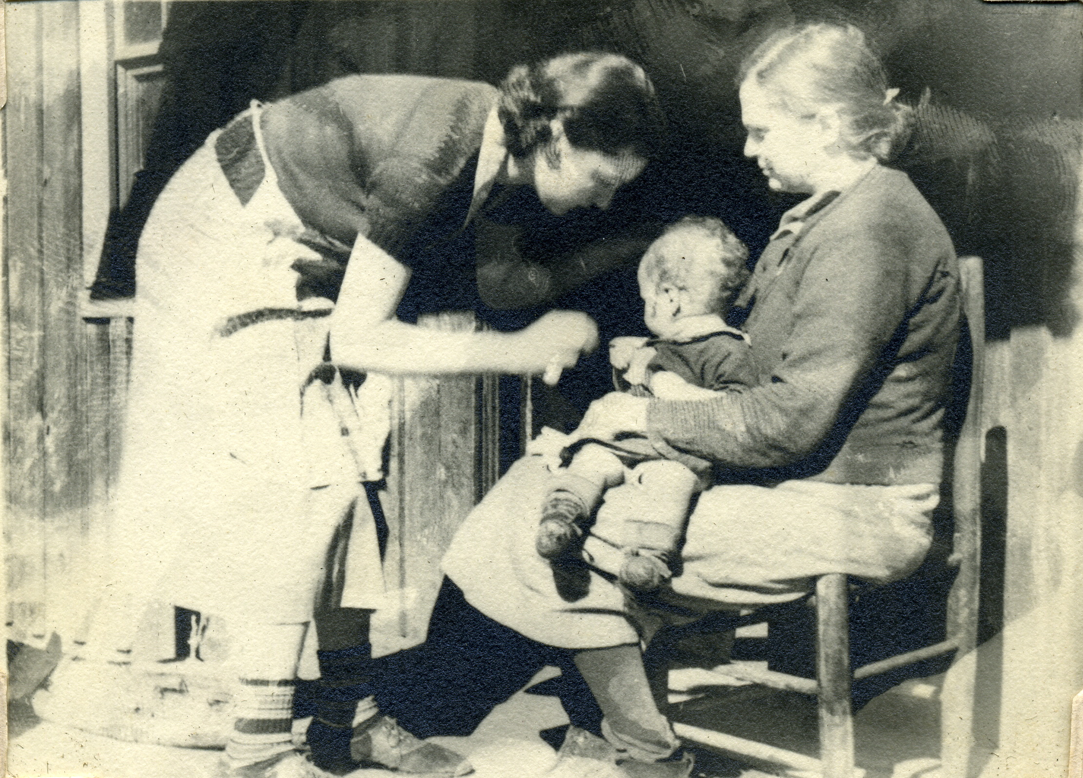 TAGS: Grace Rood, Hospital photographs, photograph albums, nurses at PMSS, nursing at PMSS, Pine Mountain Settlement School, medical education, medical educators, rural medicine,  babies delivered at PMSS, twin babies, Betty Jane Tucker, Stella Taylor, Dr. Abby N. LittleDr. Emma B. Tucker, Dr. Francis F. Tucker, Grace Feng Liu, inoculations, x-ray machines, Dr. Brown, West Wind Hospital, William Creech Hospital, industrial training, Laurel House dining