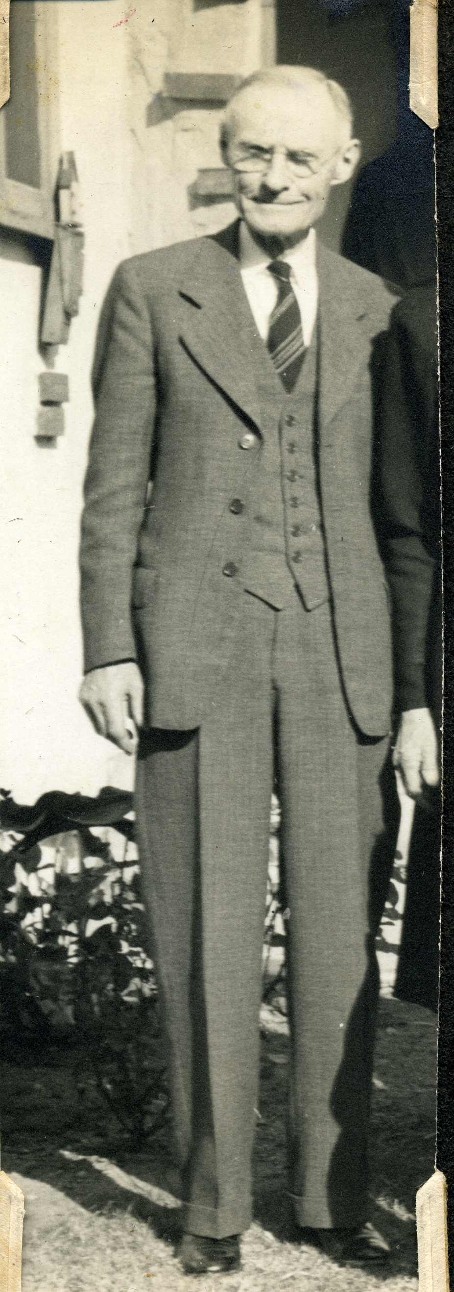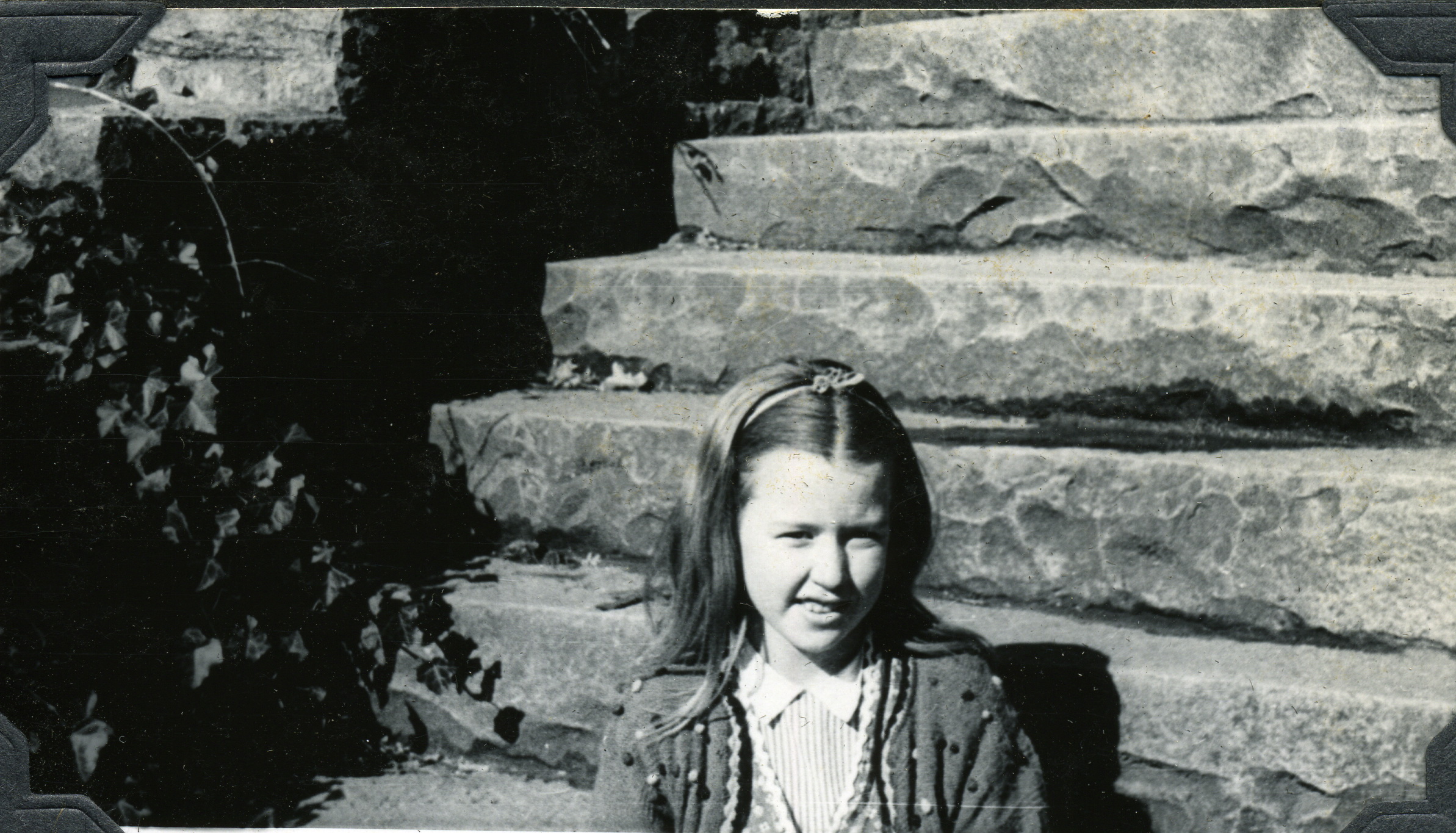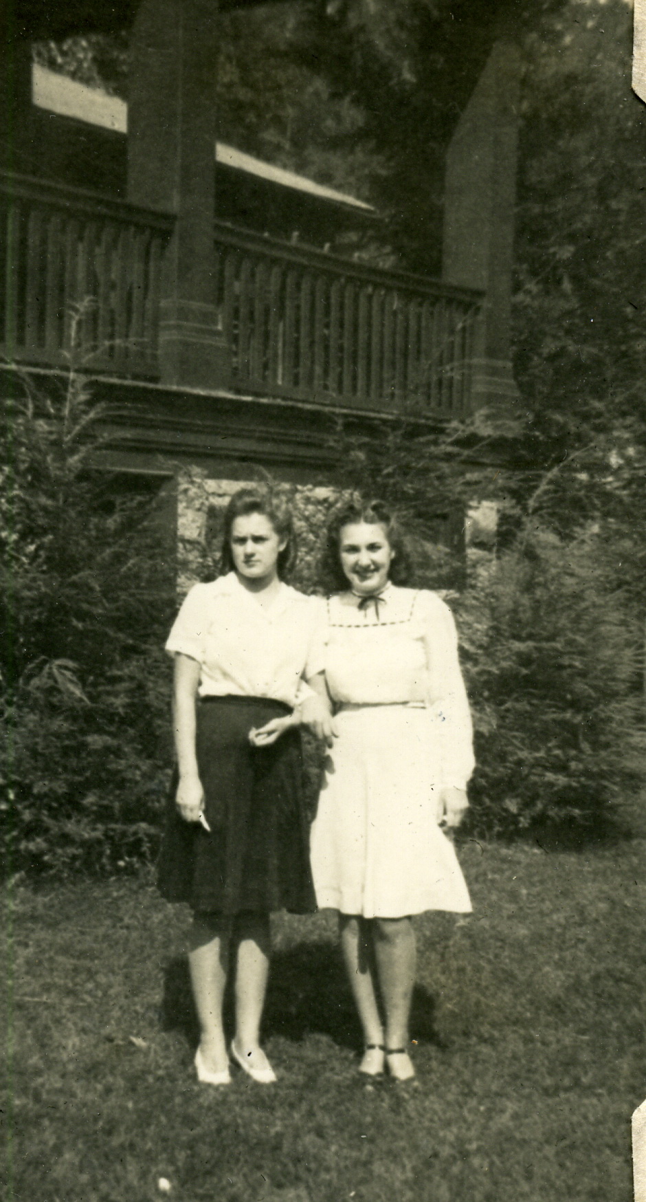 Grace M. Rood, standing on walkway at the Infirmary. Grace Rood Album. [rood_025.jpg]