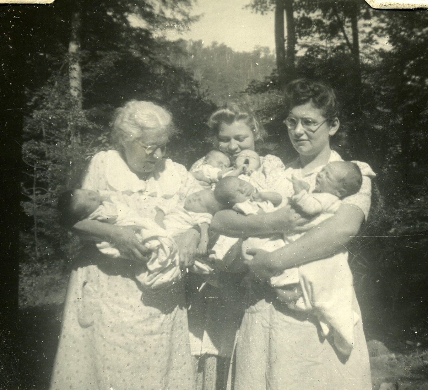 - Grace Rood and three babies (left), Dr. Emma Tucker with two (center), babies, ? to rt.(center), and other nurse with two babies (rt) Grace Rood Album.