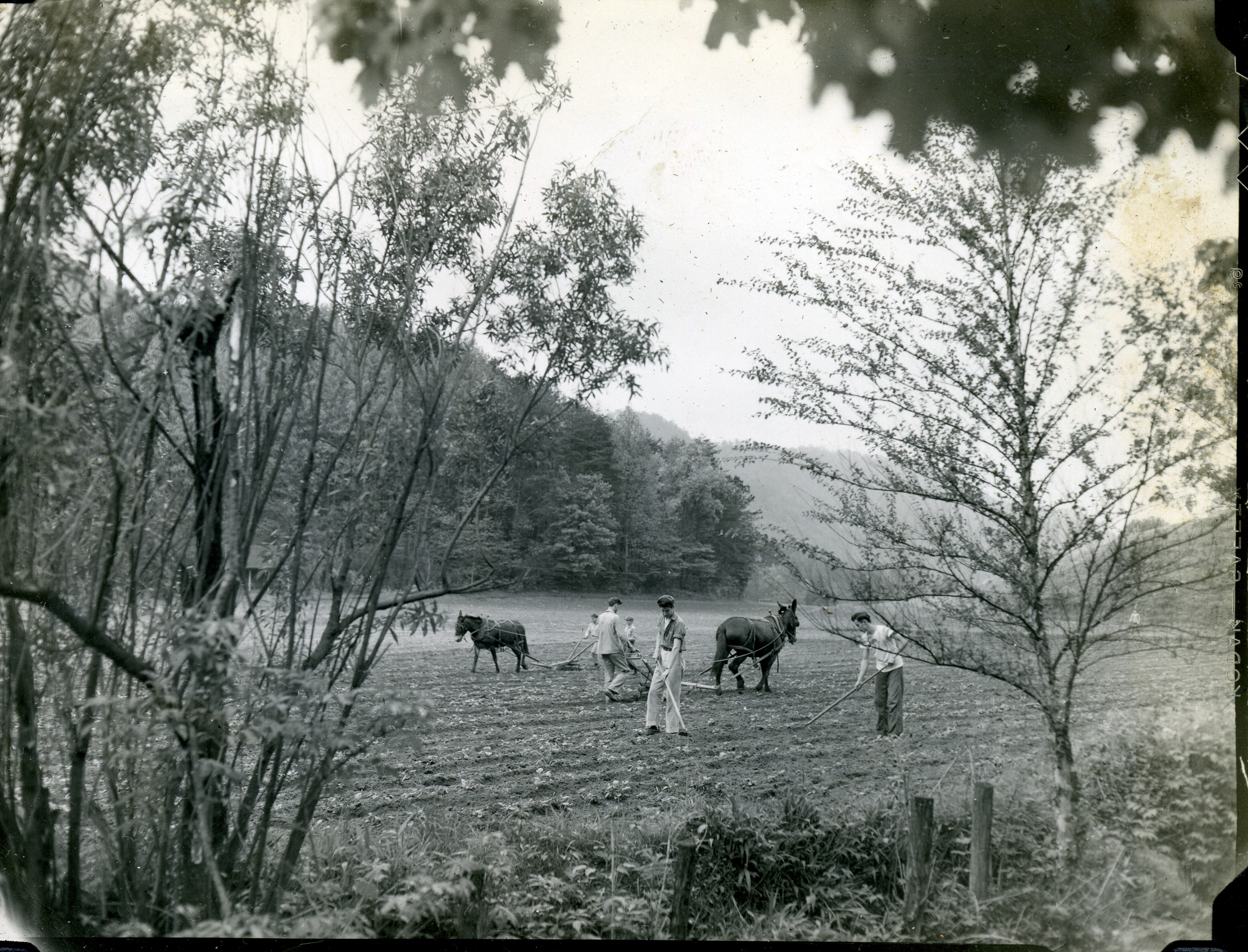- Plowing field with mules in front of Laurel House. Grace Rood Album.