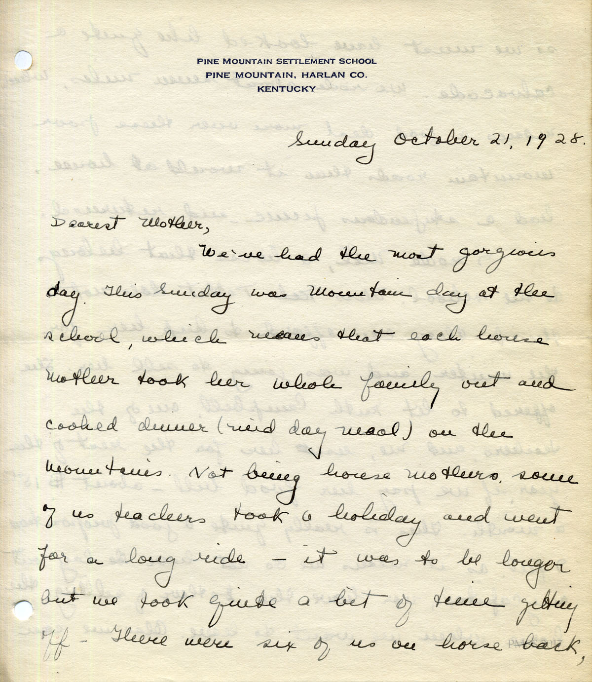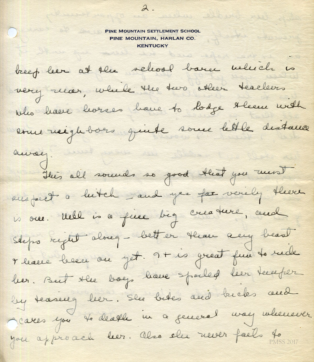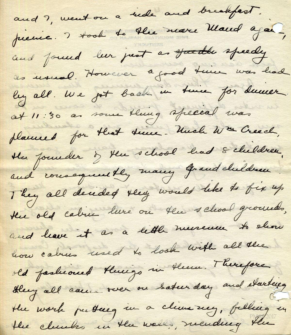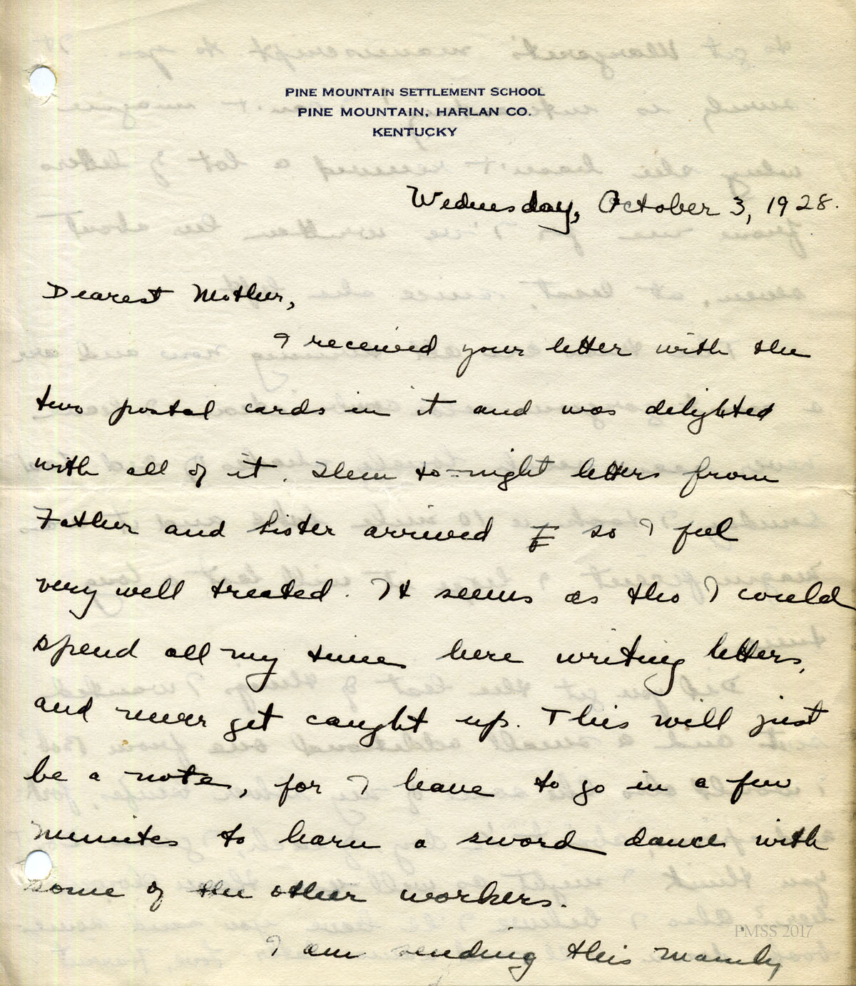 In the summer of 2017 John Orndorff, Harriet Crutchfield’s son, visited Pine Mountain Settlement School and brought along the following “journal” comprised of letters his mother, Harriet, wrote to family and friends during her time as a teacher at Pine Mountain Settlement School. Over 200 pages of Harriet’s observations, reflections, and experiences fill the small black binder. Her son noted when talking with the staff at Pine Mountain that he could think of no better place for the journal to be appreciated. His generosity and his astute assessment of the journal’s importance to Pine Mountain Settlement are profoundly appreciated.