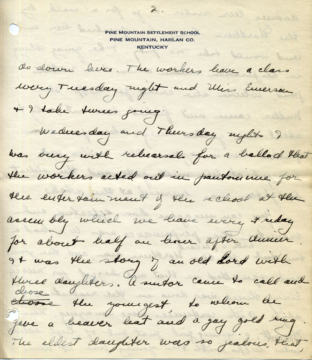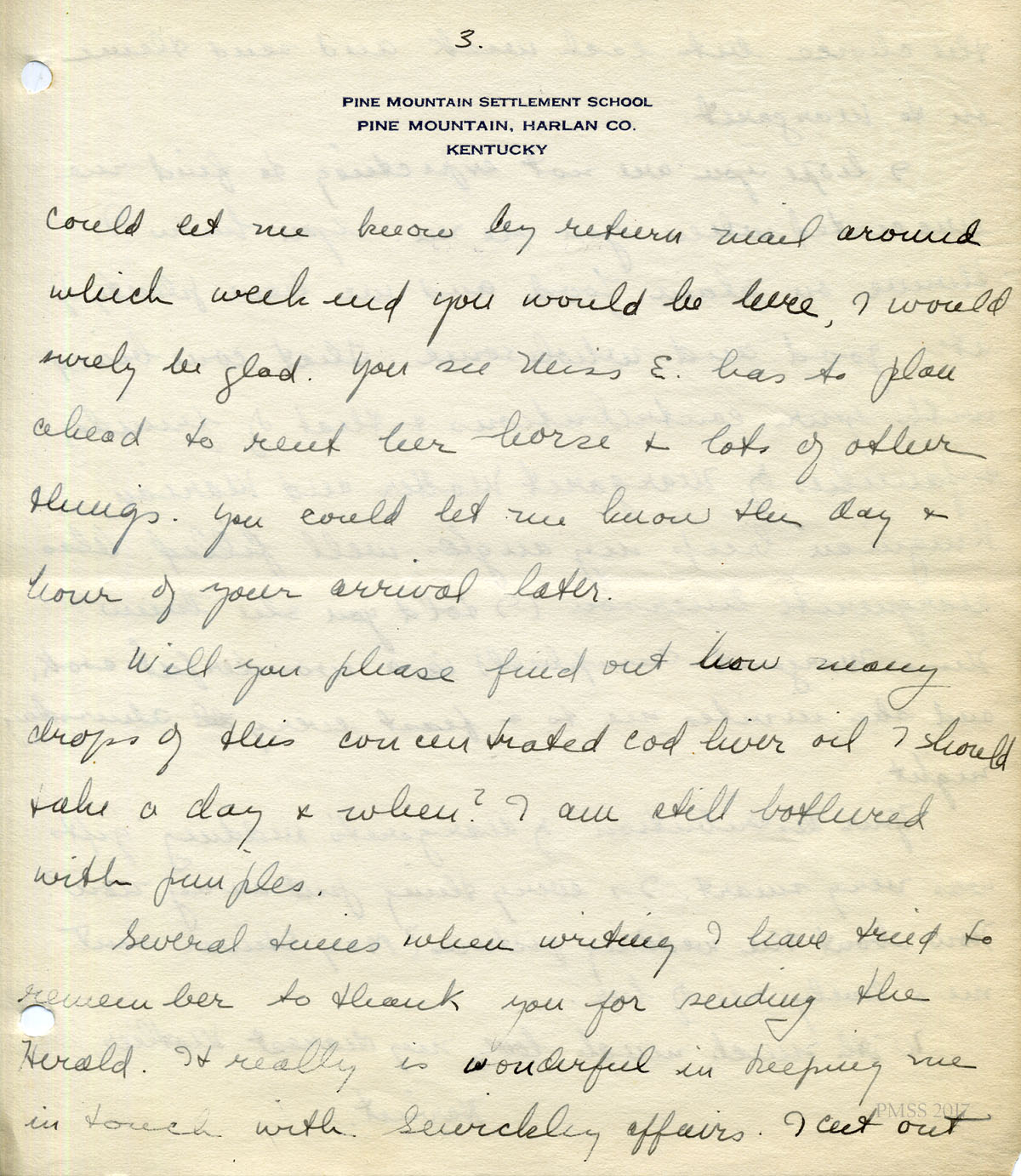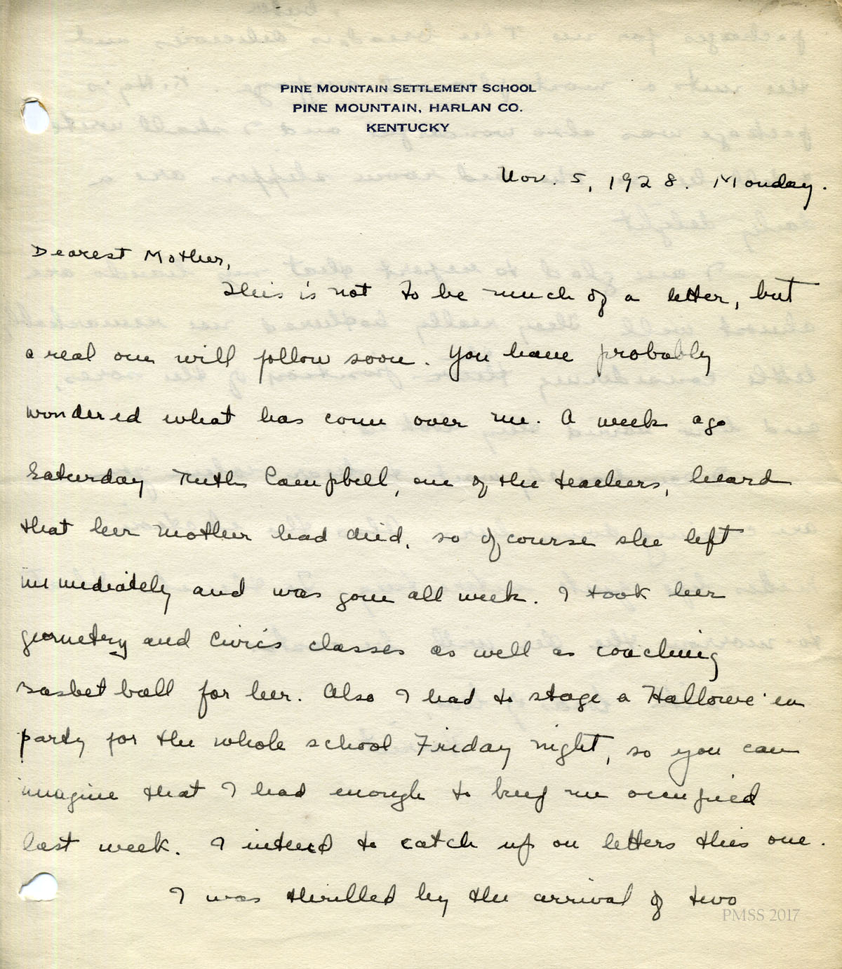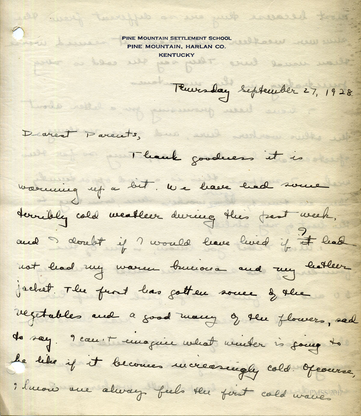 In the summer of 2017 John Orndorff, Harriet Crutchfield’s son, visited Pine Mountain Settlement School and brought along the following “journal” comprised of letters his mother, Harriet, wrote to family and friends during her time as a teacher at Pine Mountain Settlement School. Over 200 pages of Harriet’s observations, reflections, and experiences fill the small black binder. Her son noted when talking with the staff at Pine Mountain that he could think of no better place for the journal to be appreciated. His generosity and his astute assessment of the journal’s importance to Pine Mountain Settlement are profoundly appreciated.