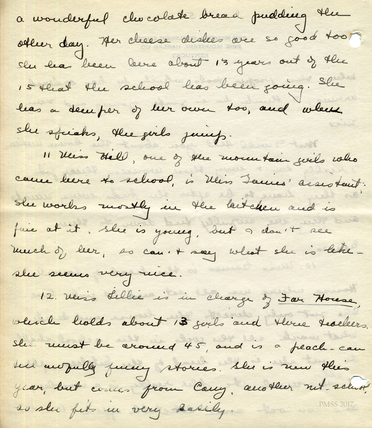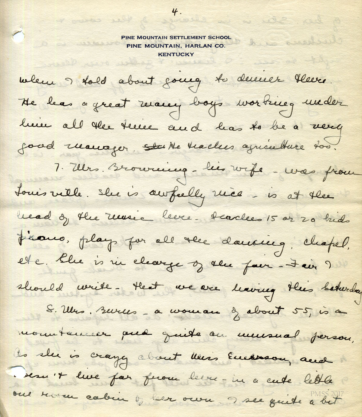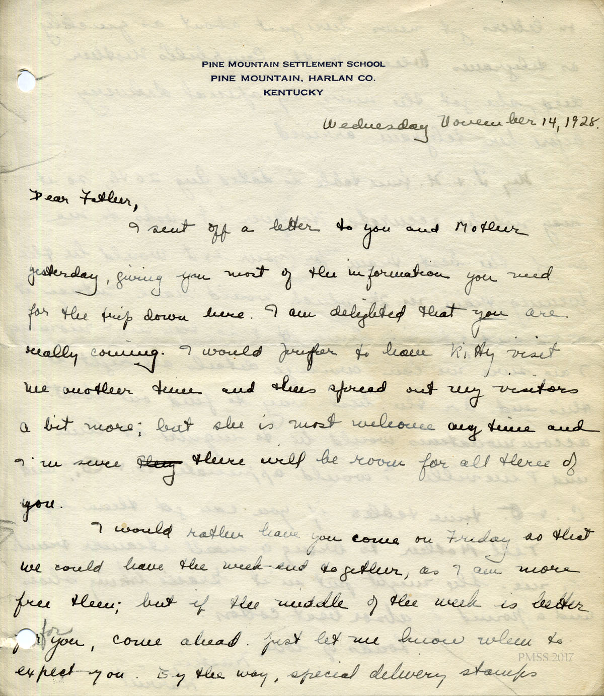 Harriet’s “journal” — the compilation of her letters to her family and friends — chronicles a close and often very personal view of a first-comer to Pine Mountain Settlement School. Her letters track her adaptation to the values, lifestyle, and relationships during the early years of the settlement institution, just following the death of co-founder Ethel de Long Zande. Her letters are crammed with observations of people, schedules, the beauty of the mountains, the language, and especially the food. Her letters provide microscopic details that many of her colleagues failed to record or notice. While the time-span of the letters, only 1928 to 1930 is short, her account is the next best thing to being there and her enthusiasm infectious.