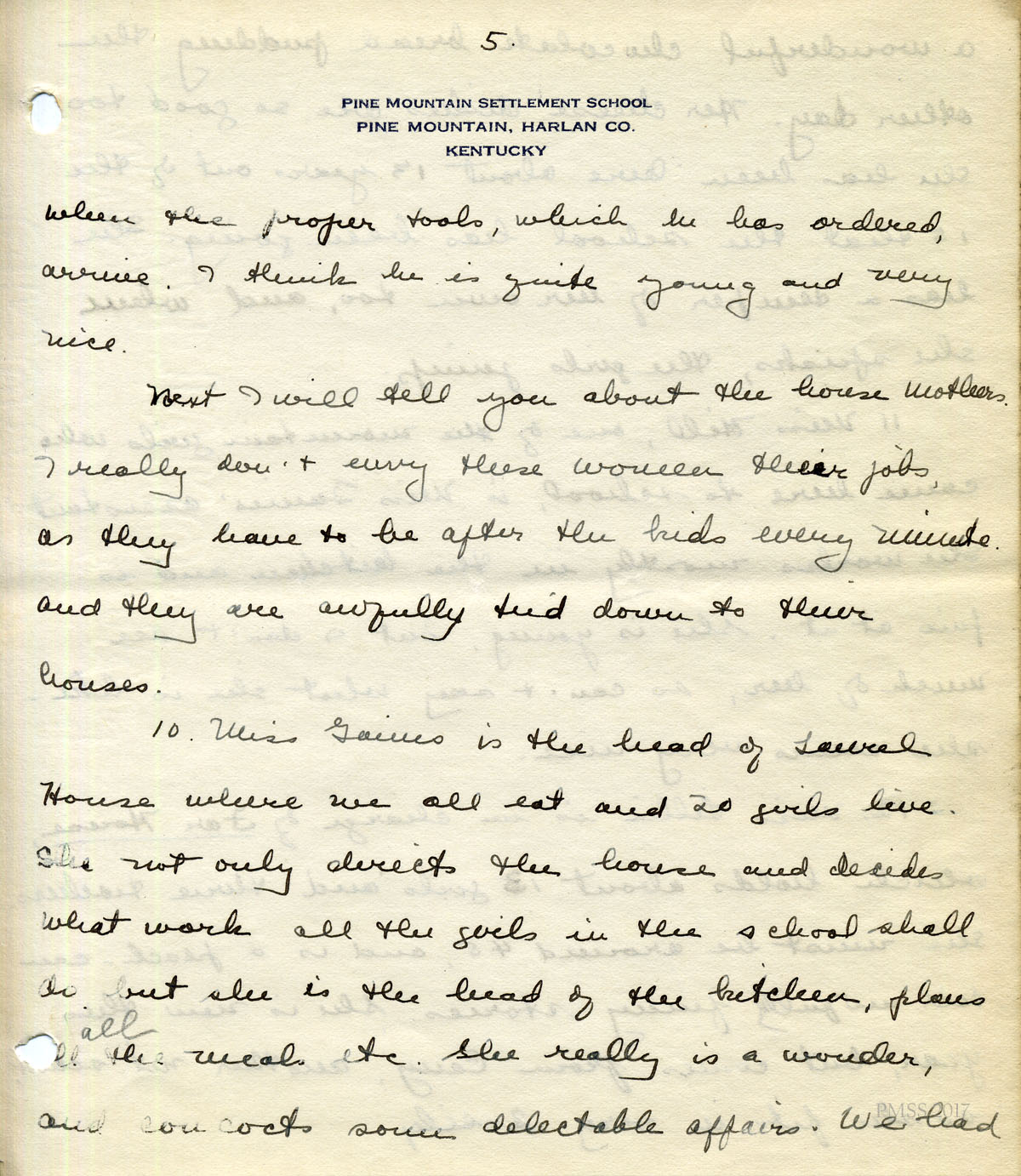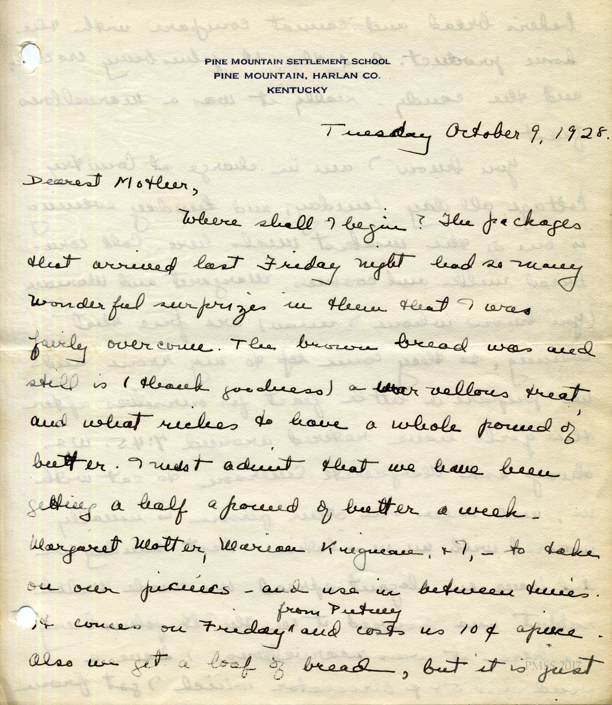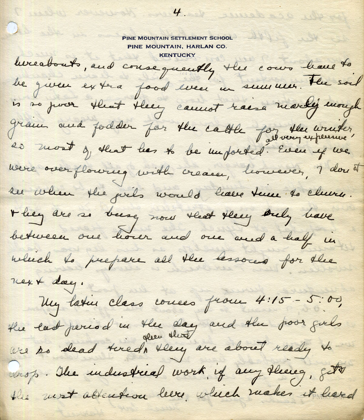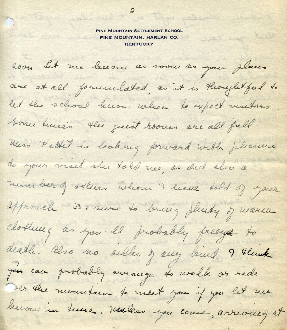 Harriet’s “journal” — the compilation of her letters to her family and friends — chronicles a close and often very personal view of a first-comer to Pine Mountain Settlement School. Her letters track her adaptation to the values, lifestyle, and relationships during the early years of the settlement institution, just following the death of co-founder Ethel de Long Zande. Her letters are crammed with observations of people, schedules, the beauty of the mountains, the language, and especially the food. Her letters provide microscopic details that many of her colleagues failed to record or notice. While the time-span of the letters, only 1928 to 1930 is short, her account is the next best thing to being there and her enthusiasm infectious.