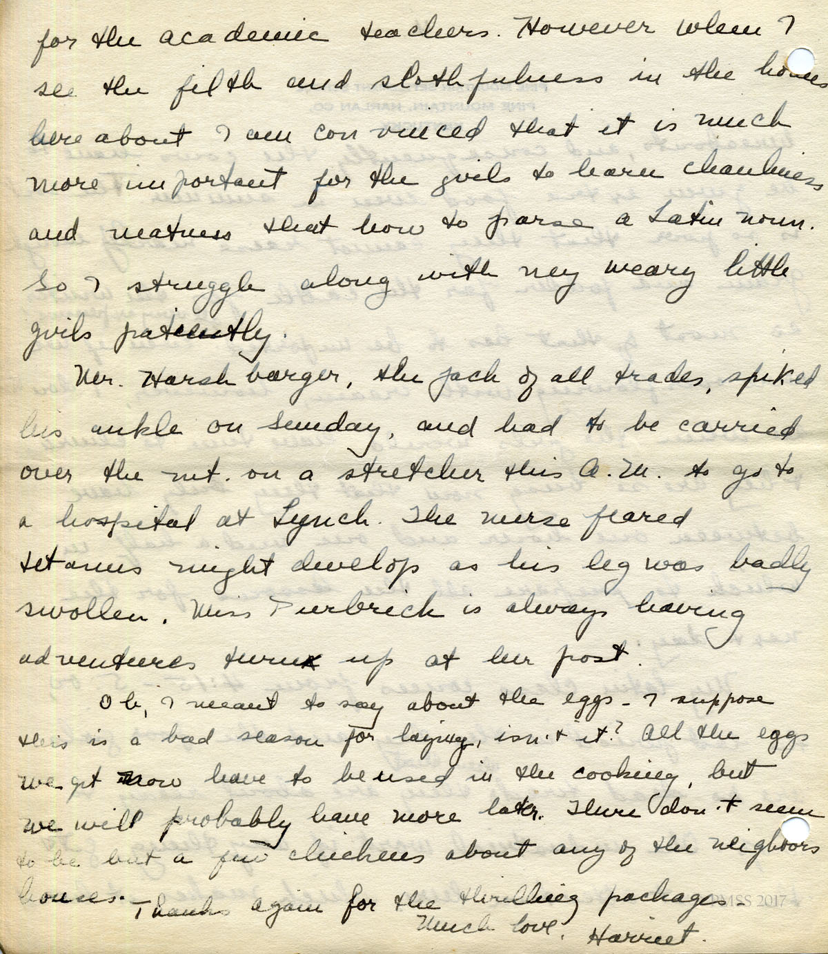 TAGS: Harriet Crutchfield Journal Part 2, Harriet Crutchfield Orndorff, teachers, PMSS Advisory Board, James S. Crutchfield, Alice (Pilkington) Crutchfield, John Orndorff’s donation of his mother’s journal, PMSS Board of Trustees, American Fruit Growers Association, organized marketing of produce, Blue Goose brand, scholarships, images of Harriet Crutchfield’s letters