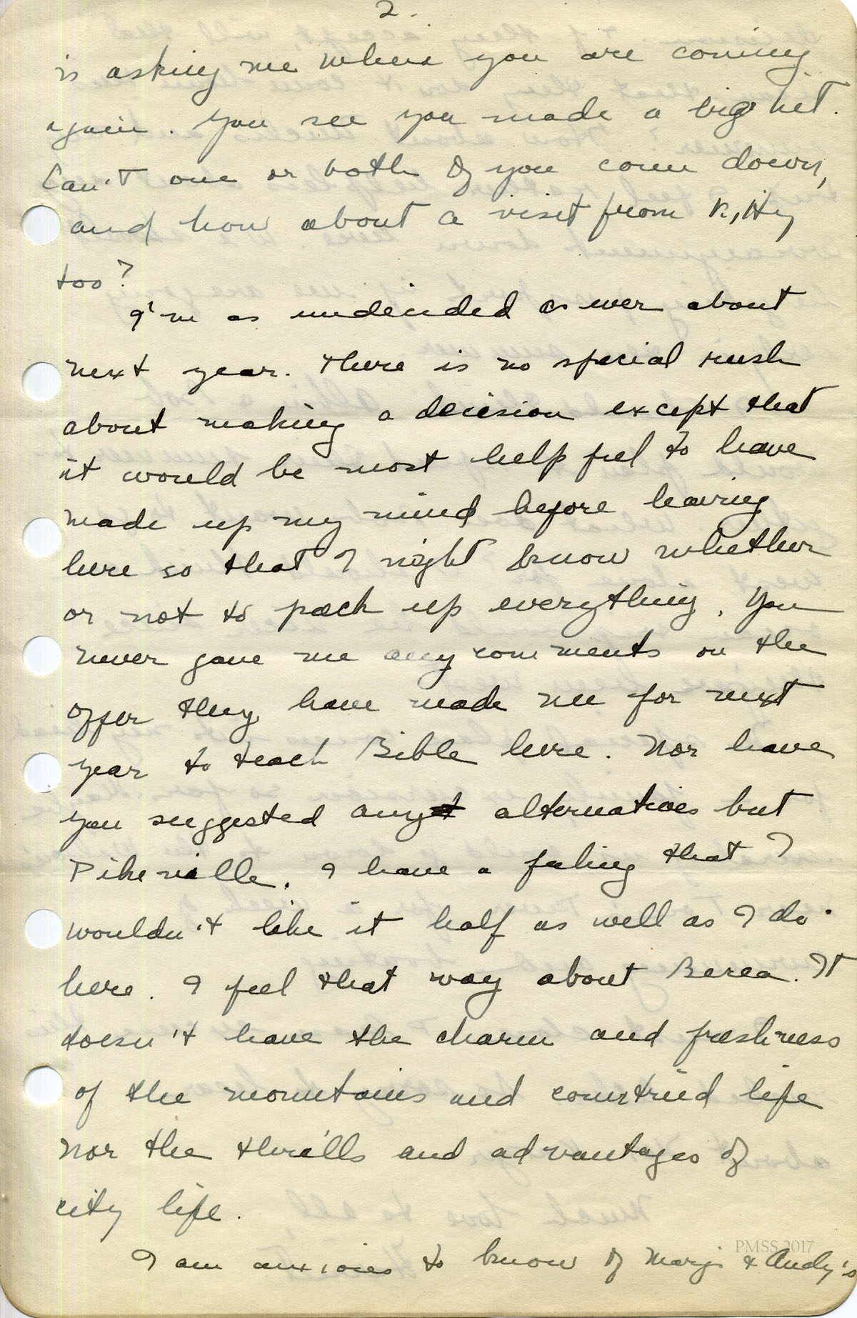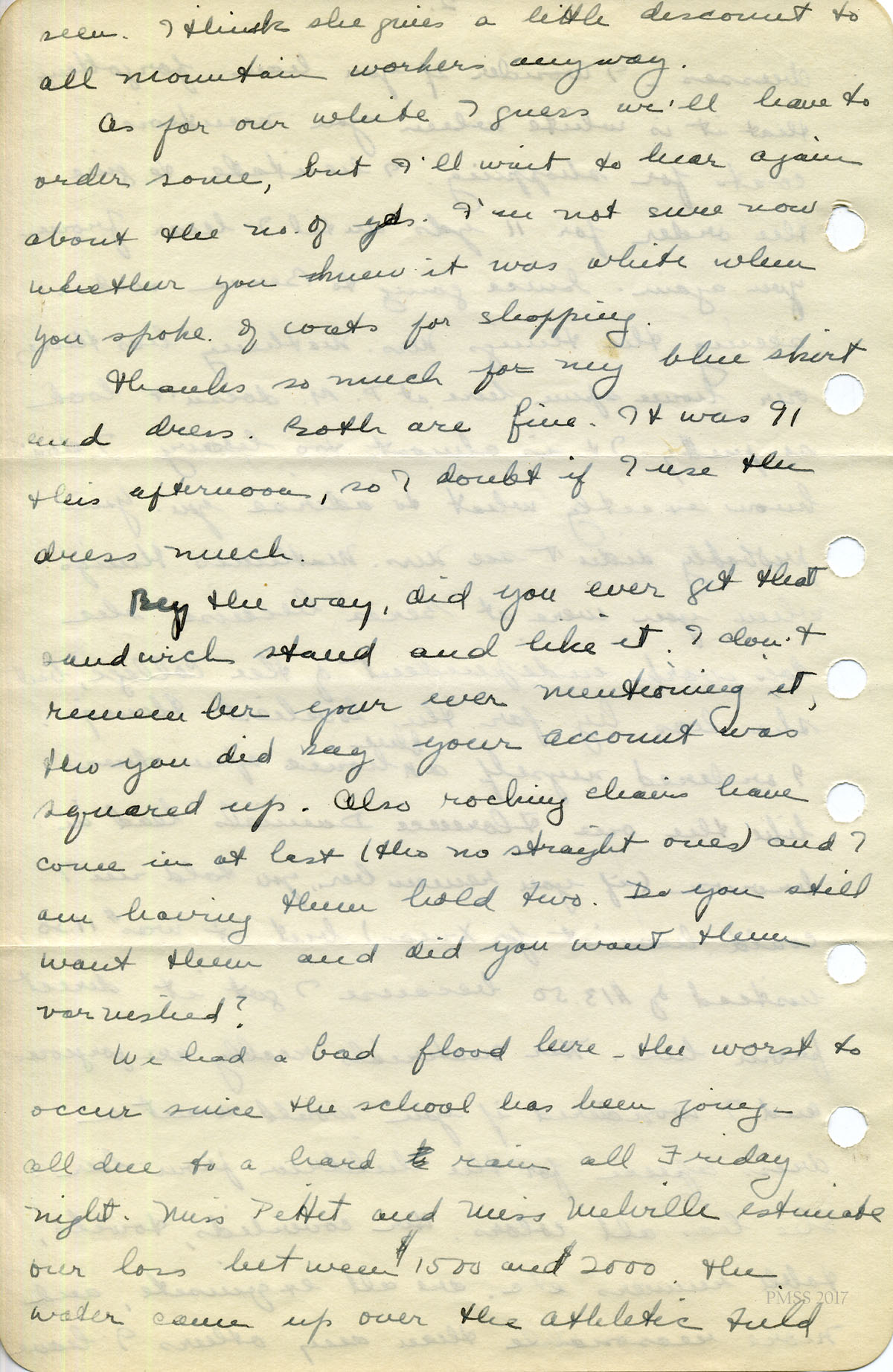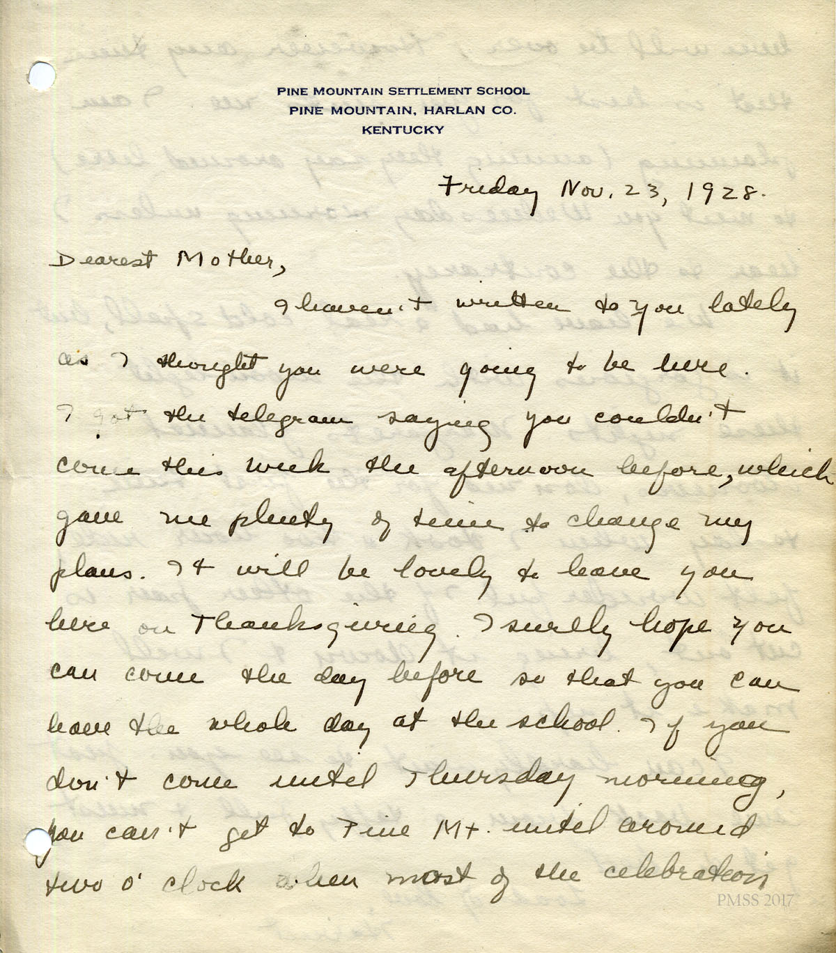 In the summer of 2017 John Orndorff, Harriet Crutchfield’s son, visited Pine Mountain Settlement School and brought along the following “journal” comprised of letters his mother, Harriet, wrote to family and friends during her time as a teacher at Pine Mountain Settlement School. Over 200 pages of Harriet’s observations, reflections, and experiences fill the small black binder. Her son noted when talking with the staff at Pine Mountain that he could think of no better place for the journal to be appreciated. His generosity and his astute assessment of the journal’s importance to Pine Mountain Settlement are profoundly appreciated.