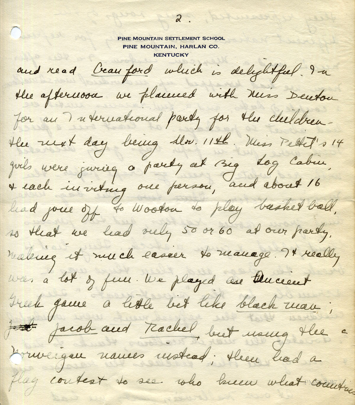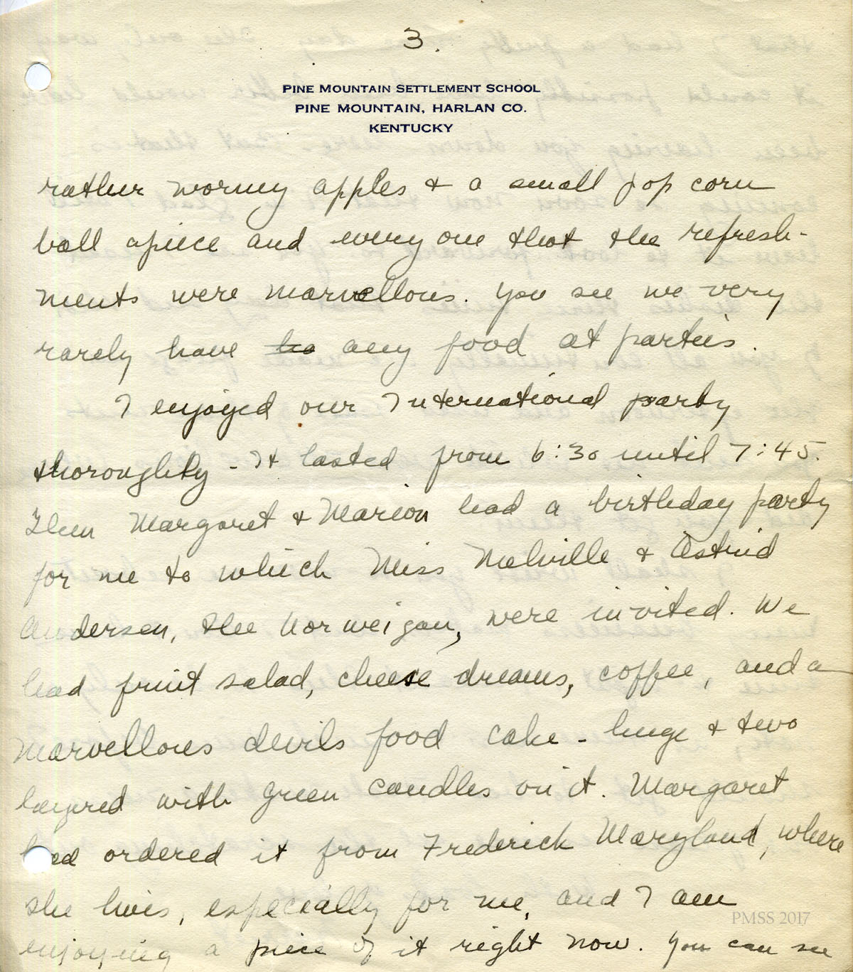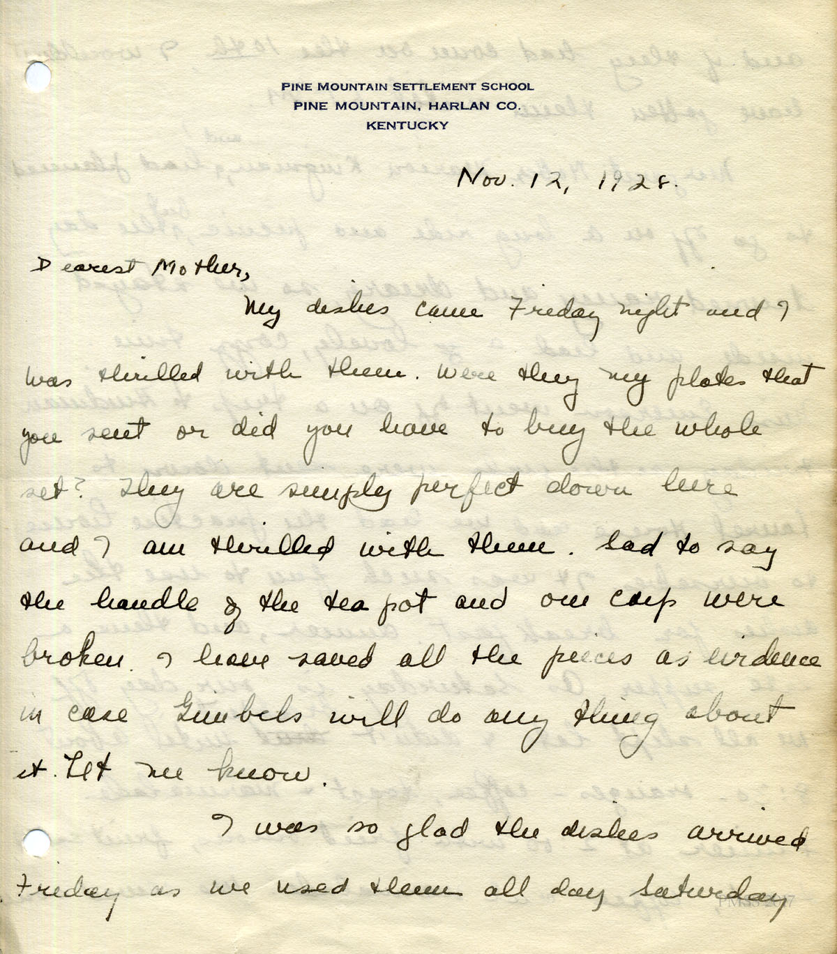 Harriet’s “journal” — the compilation of her letters to her family and friends — chronicles a close and often very personal view of a first-comer to Pine Mountain Settlement School. Her letters track her adaptation to the values, lifestyle, and relationships during the early years of the settlement institution, just following the death of co-founder Ethel de Long Zande. Her letters are crammed with observations of people, schedules, the beauty of the mountains, the language, and especially the food. Her letters provide microscopic details that many of her colleagues failed to record or notice. While the time-span of the letters, only 1928 to 1930, is short, her account is the next best thing to being there and her enthusiasm infectious.