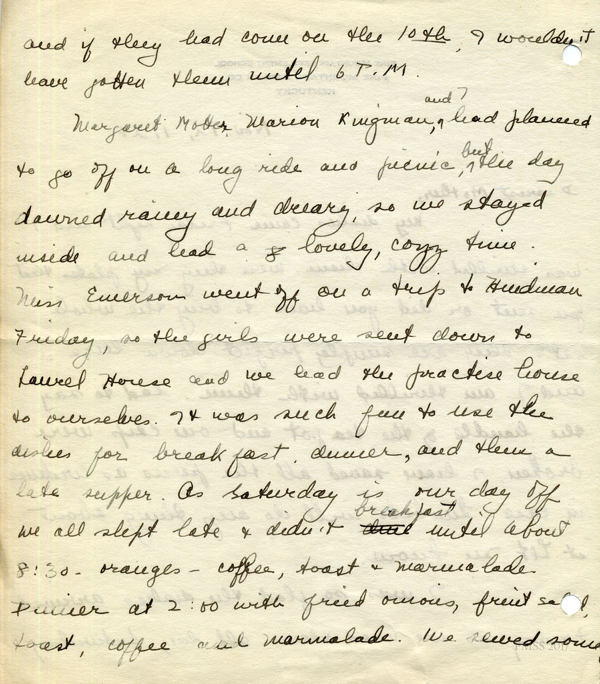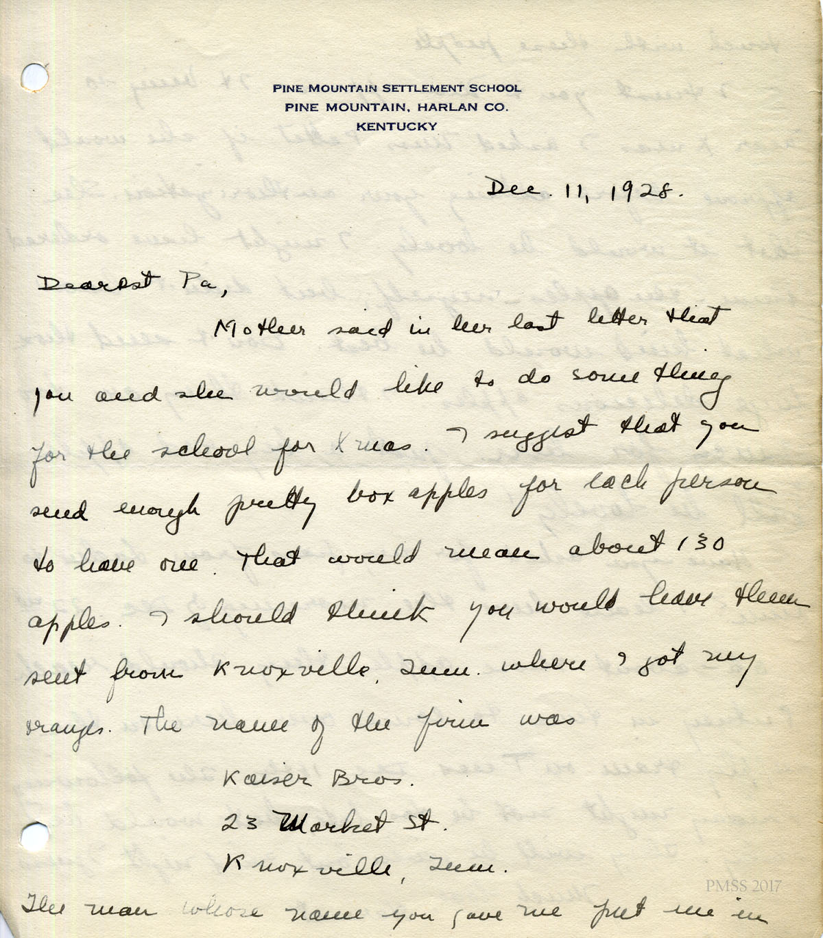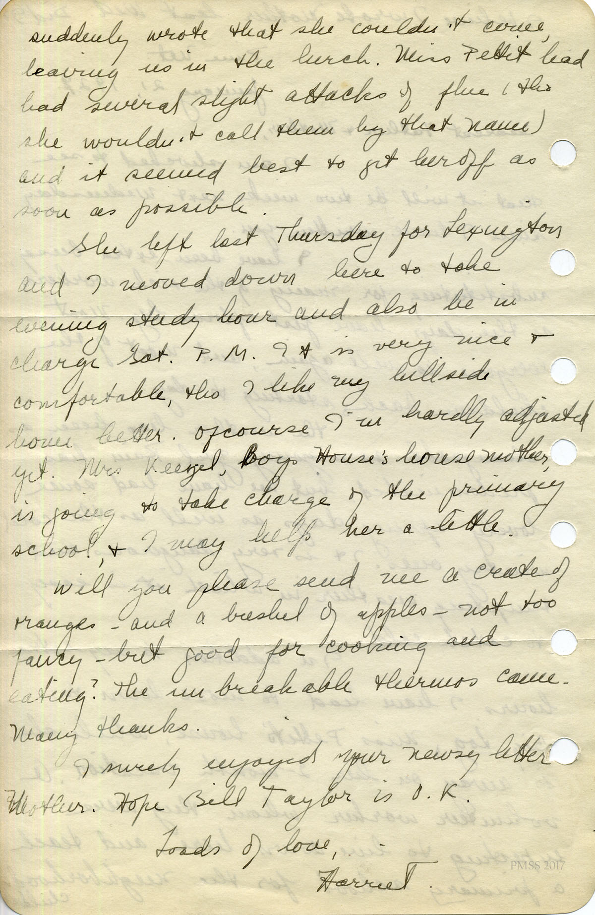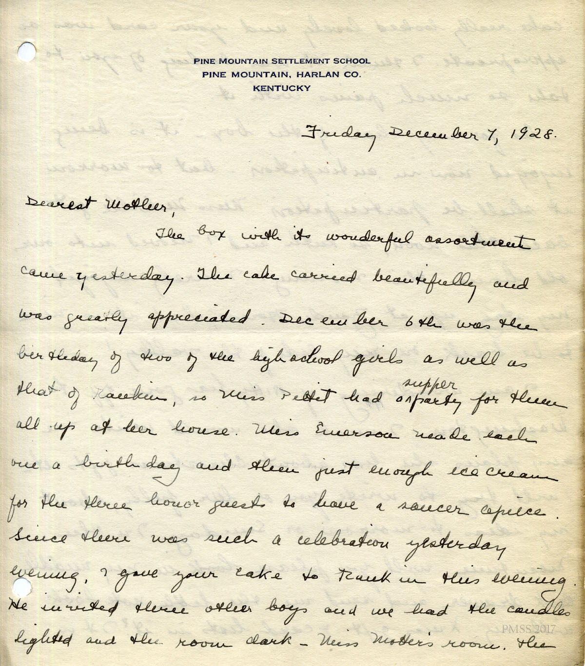 Harriet’s “journal” — the compilation of her letters to her family and friends — chronicles a close and often very personal view of a first-comer to Pine Mountain Settlement School. Her letters track her adaptation to the values, lifestyle, and relationships during the early years of the settlement institution, just following the death of co-founder Ethel de Long Zande. Her letters are crammed with observations of people, schedules, the beauty of the mountains, the language, and especially the food. Her letters provide microscopic details that many of her colleagues failed to record or notice. While the time-span of the letters, only 1928 to 1930, is short, her account is the next best thing to being there and her enthusiasm infectious.