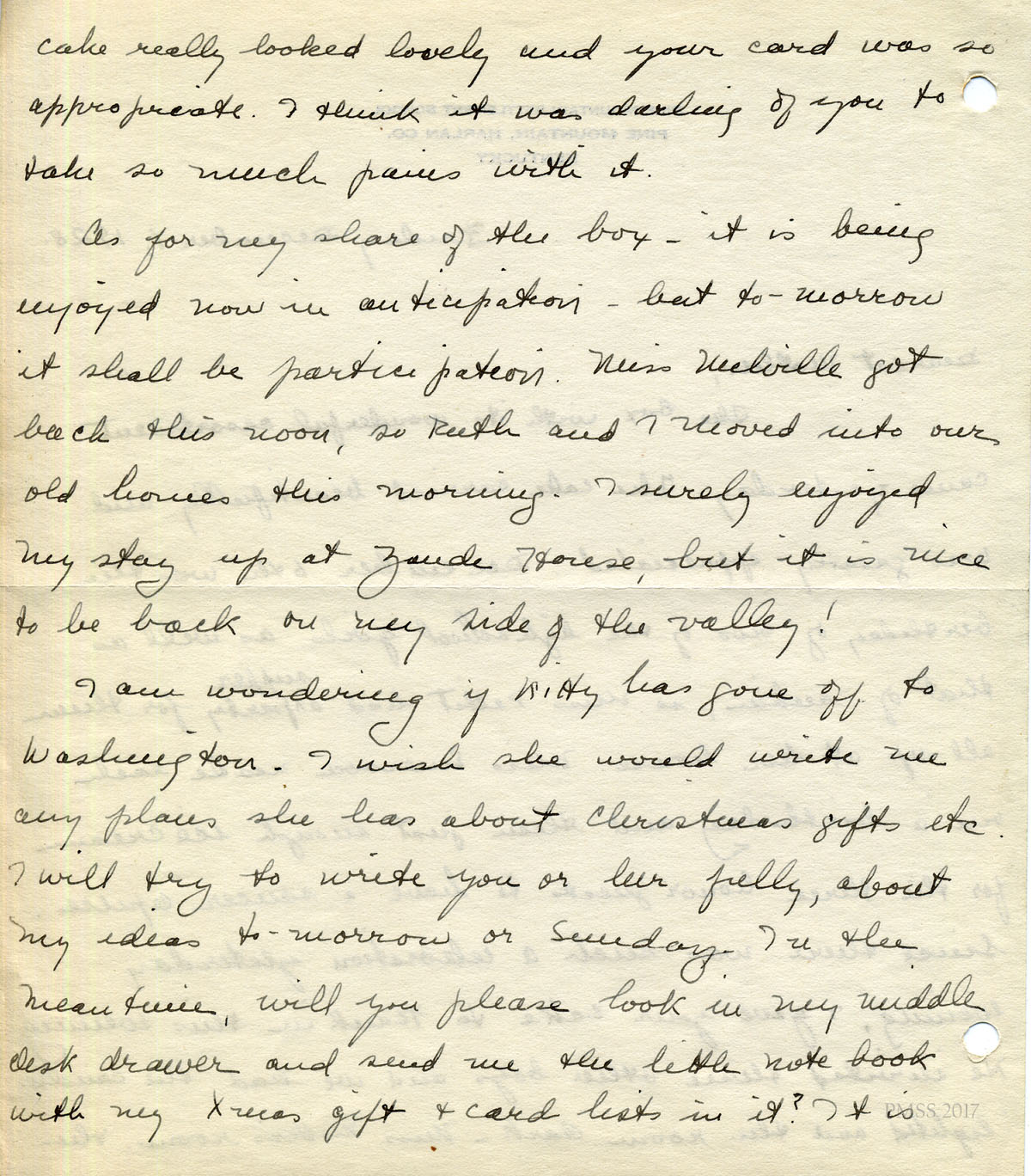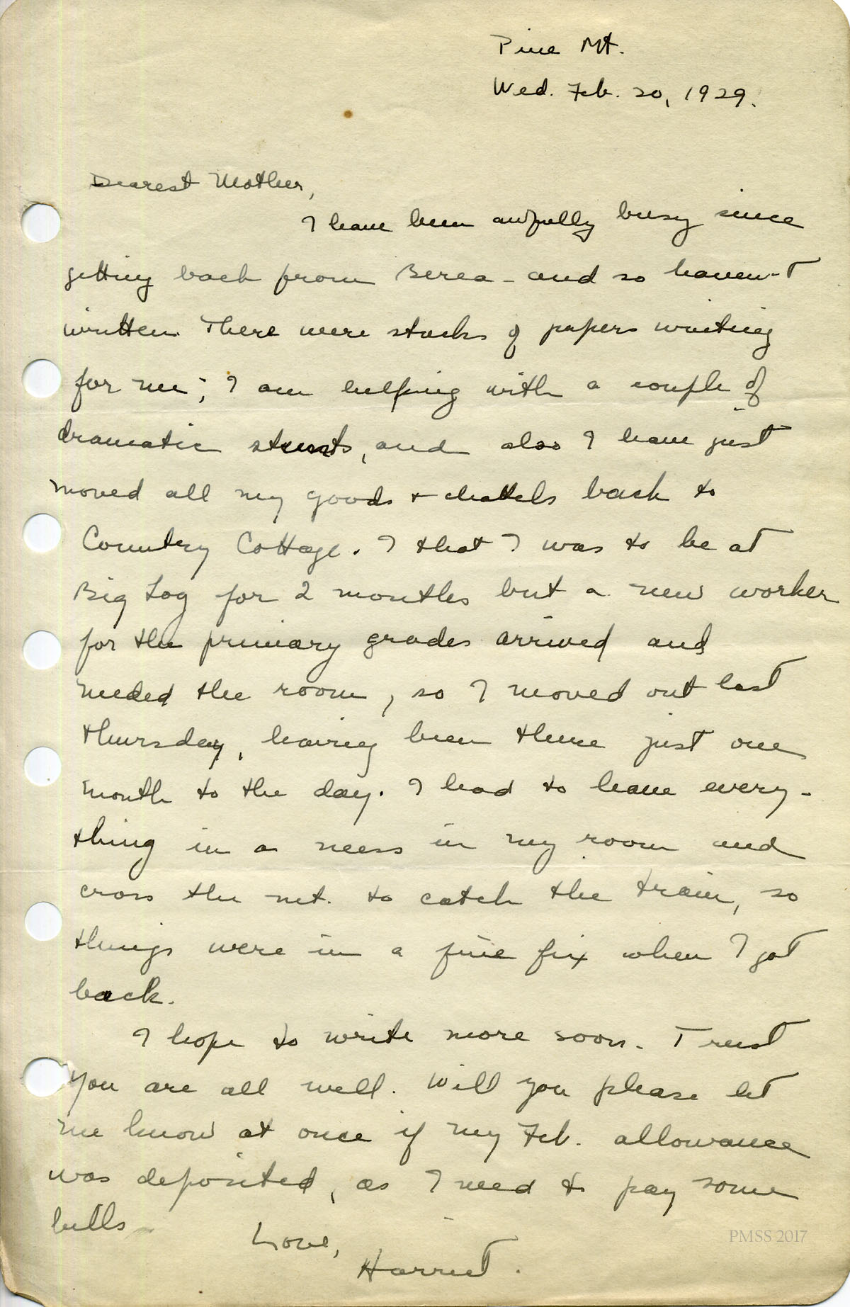 Harriet and her family developed and held a deep affection for Pine Mountain and Kentucky where their roots ran deep. Though Harriet was at Pine Mountain for only two school years, her father’s service on the Board of Trustees and Harriet’s later service on the Pine Mountain Advisory Board, extended the family’s connection. The entire family became strong supporters of Pine Mountain and its mission. Harriet continued to keep up her correspondence and contributions to the School until ill health in the 1980 limited her activity.