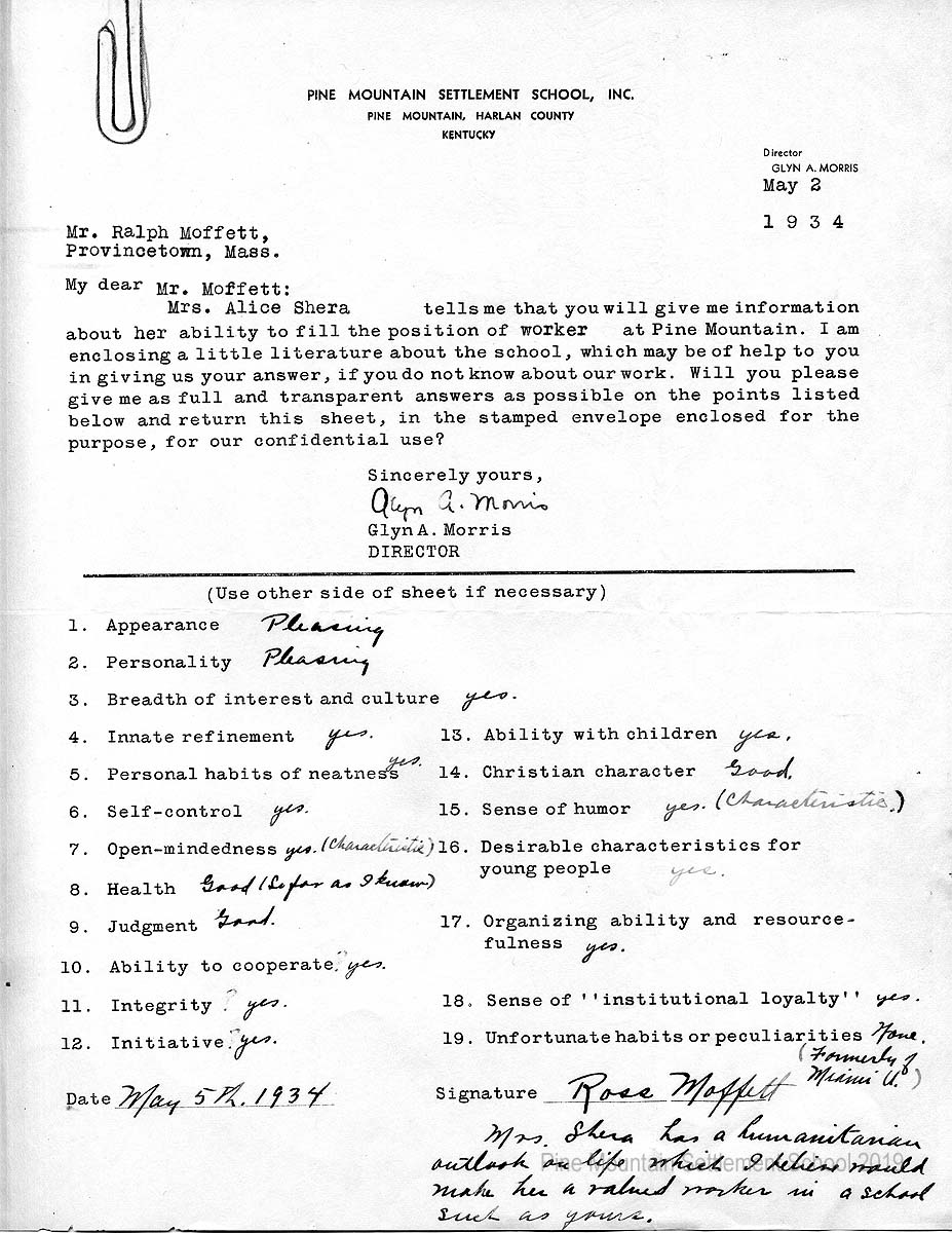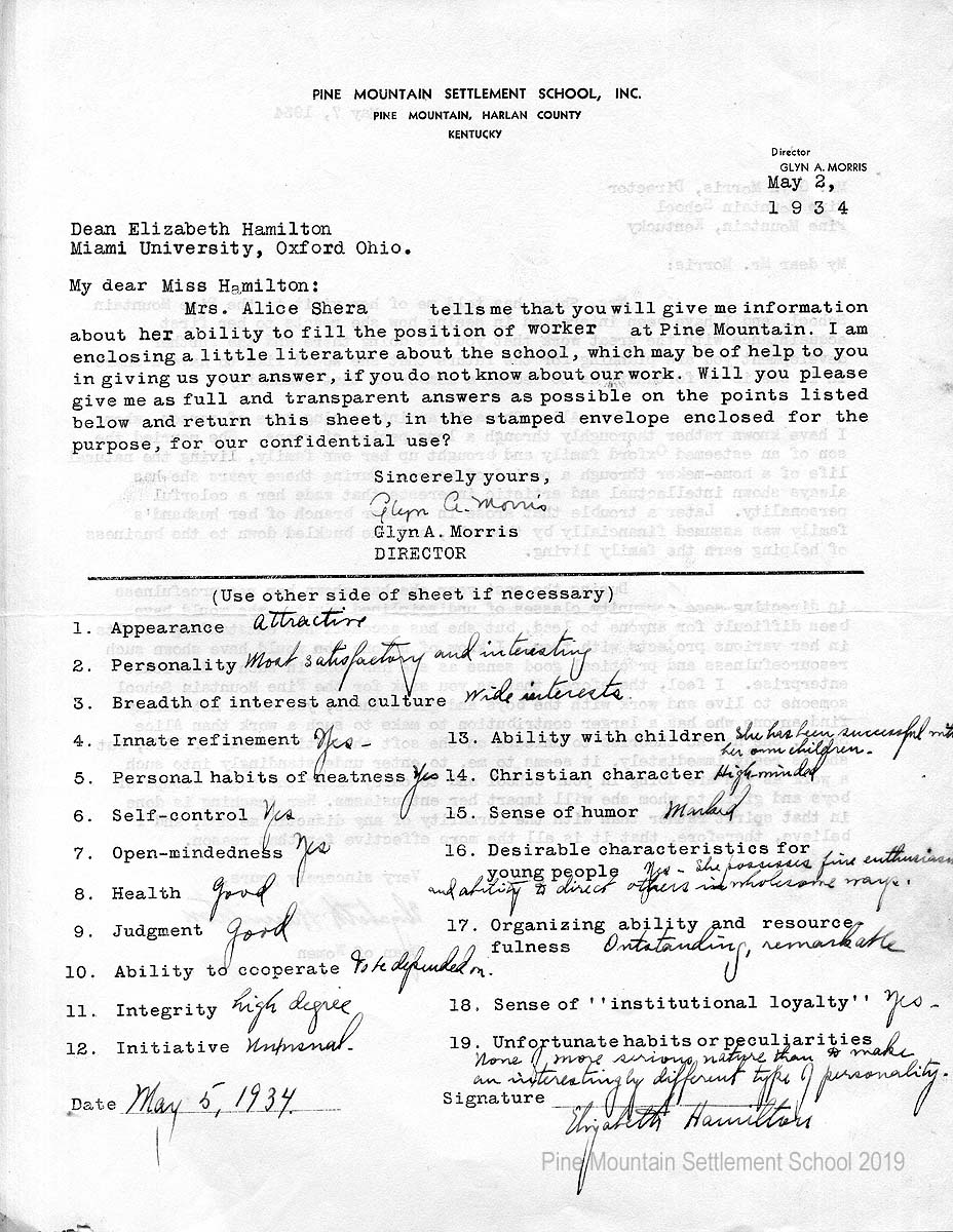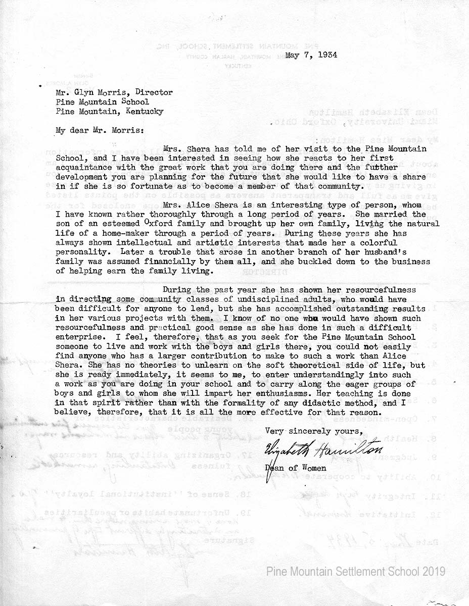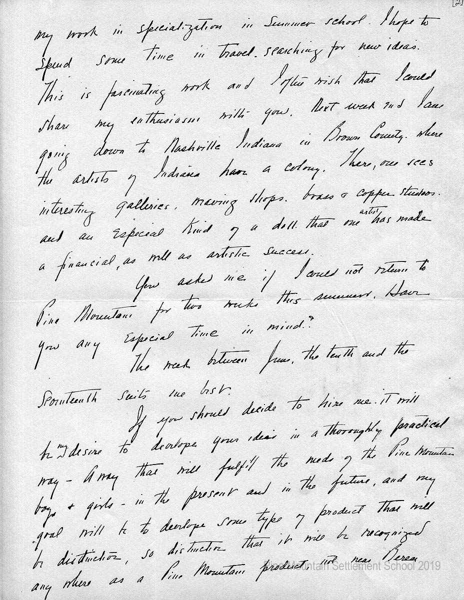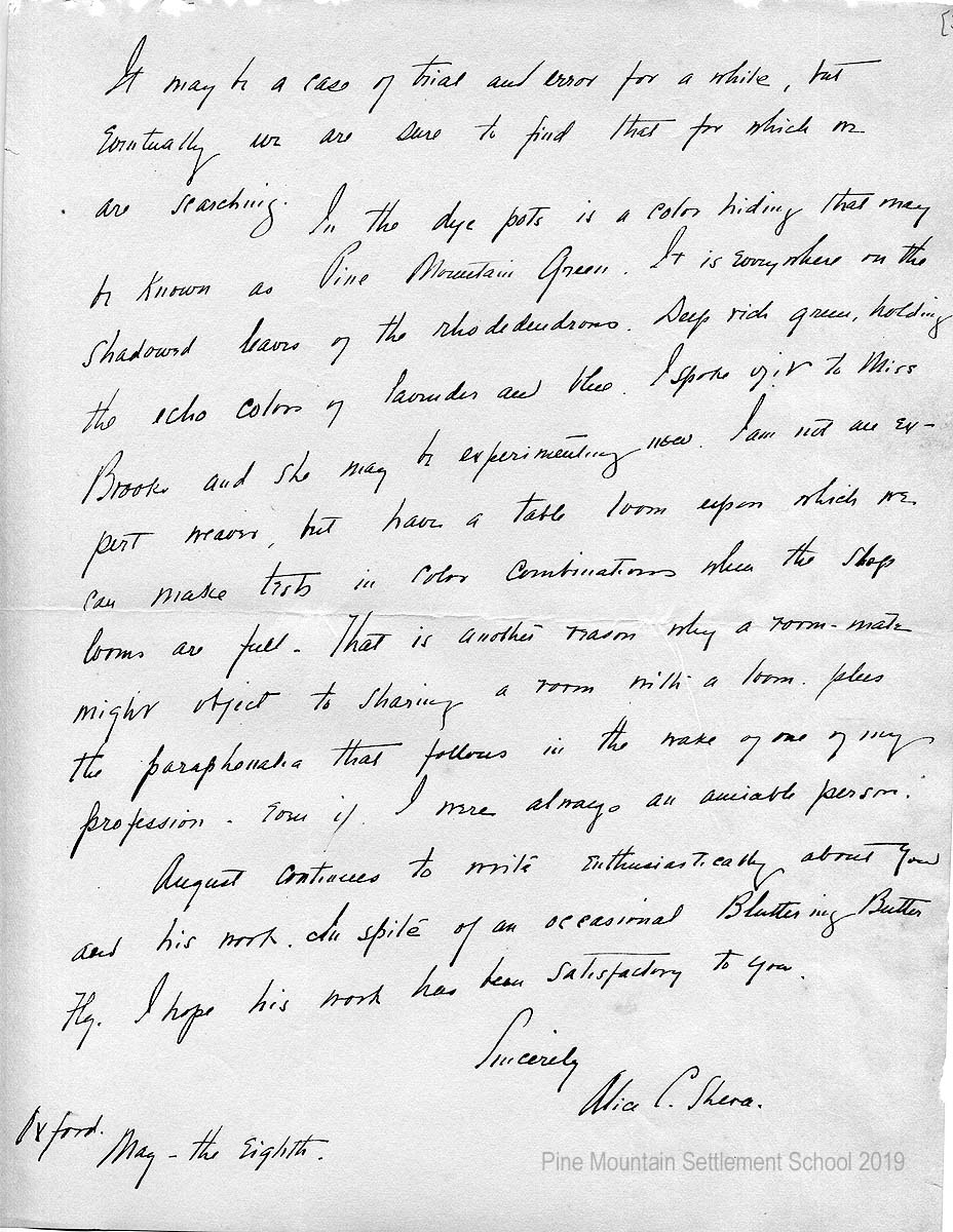 - #005-#007 1934 May 8 Alice Shera to Glyn Morris (3 pages) describing her interest in architecture and instruction in manual training as possible directions at PMSS. She tells of her connection with the Brown County artist colony at Nashville, Indiana. She waxes ecstatic regarding her dye-pot work and suggests that a “Pine Mountain Green” could be unique and profitable color for the school.