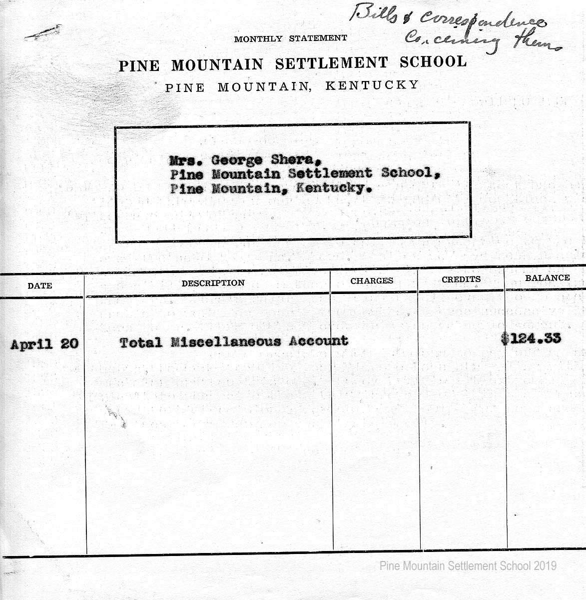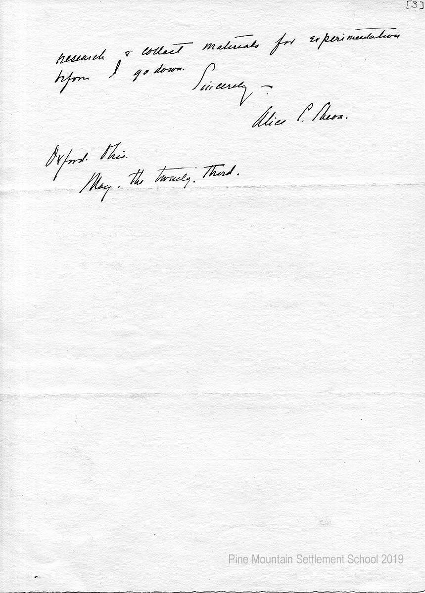 The cabins are utterly devoid of color and the average has only one door and no windows. Those are the type of houses from which my pupils have come or from mining camps that are worse. I have wondered if some gay color, telling pictures would not delight them (the parents). … The underlying idea is to teach them to use what they have intelligently and to make the everyday beautiful. I am writing to you informally believing that it will help you to help me and I am sure you find in it a satisfaction to know that you can — where it is needed so much. I did not hear from any of the people to whom you talked about material for our work. Thank you just the same.” Shera indicates that pictures are enclosed …“I hope that they will help you to understand our locality, the Pine Mt. leaflet do not return.”