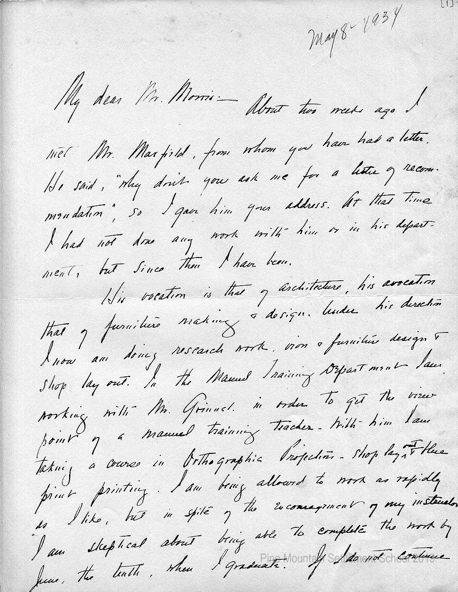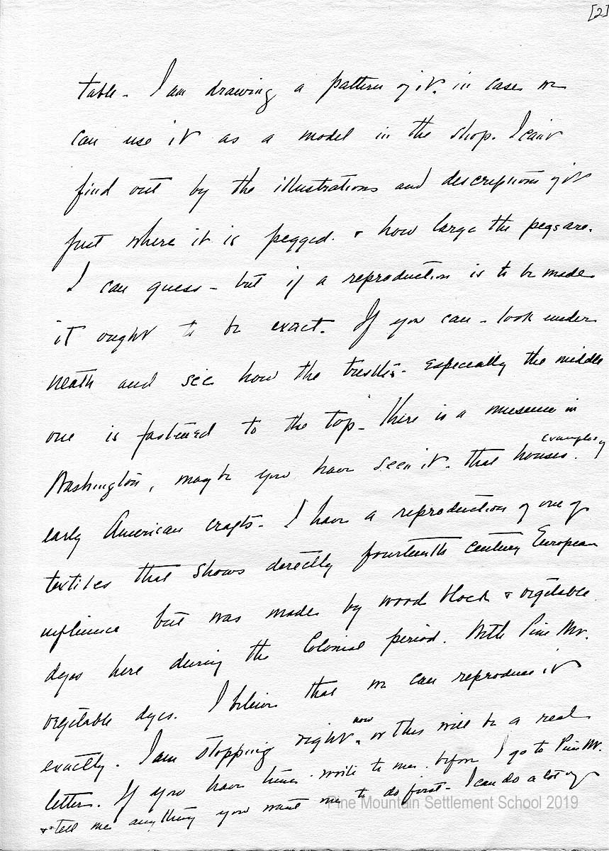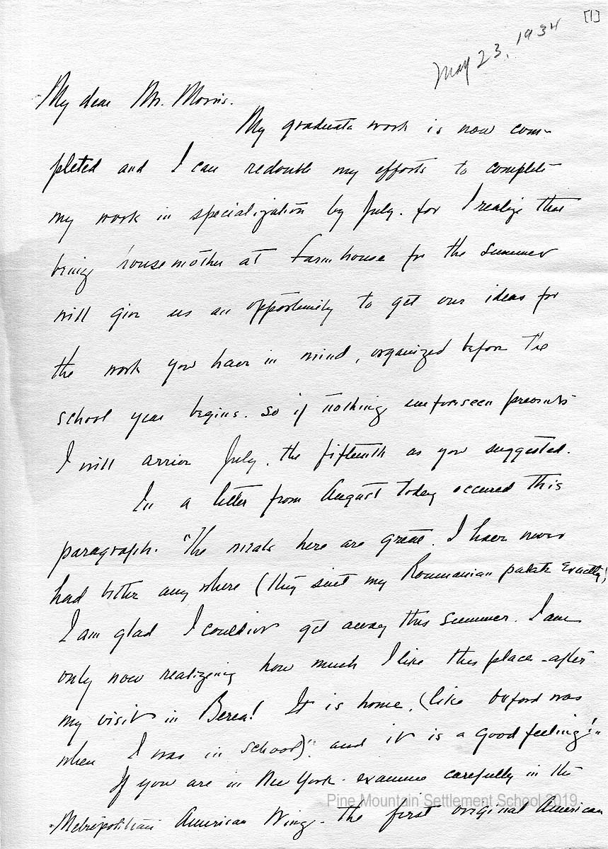 - #007-#009 1934 May 24 Alice Shera to Glyn Morris (3 pages) accepting the offer to be housemother at Farm House for the summer and will arrive on July 15 to begin work. She mentions a pegged table in the Metropolitan Museum American wing that was the earliest table in America and that she has made a pattern of the table to be tried at Pine Mountain. [The table was a trestle table]. She also mentions a Colonial textile she has seen in a Washington craft museum that uses vegetable dye block prints to decorate the cloth similar to 14th-century examples.