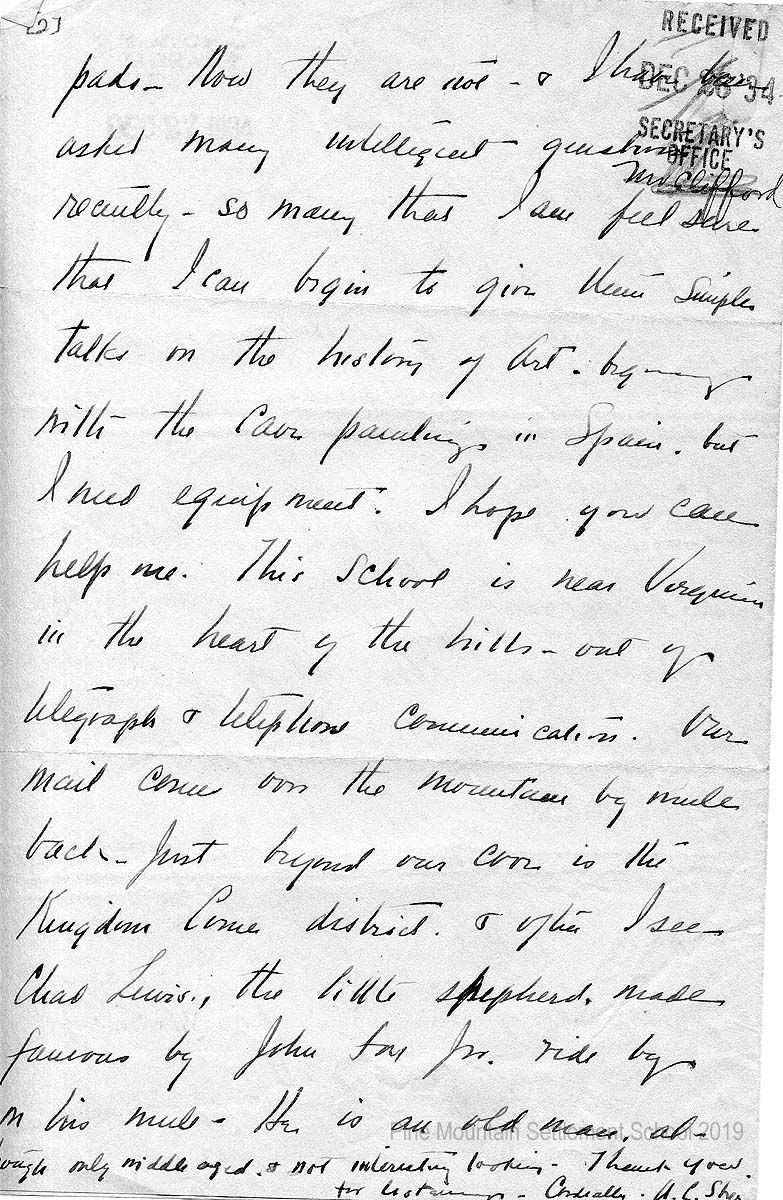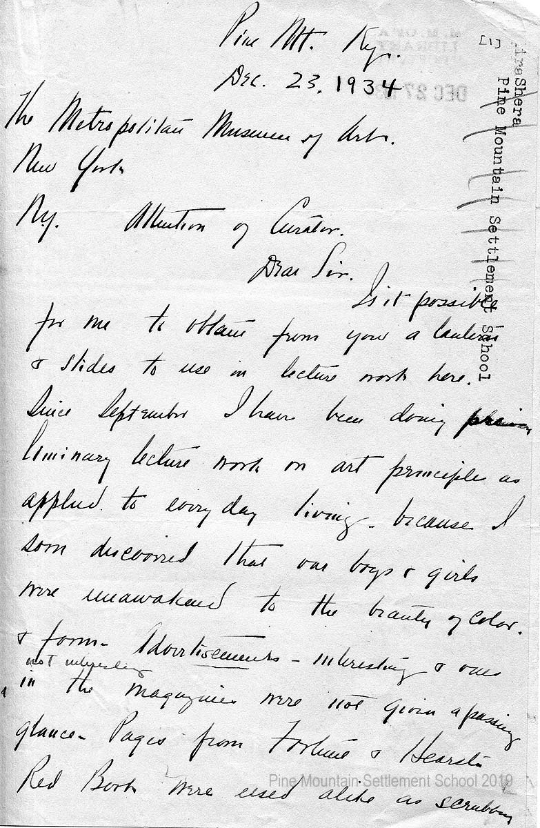 - #010-#010a (2 pages) 1934 December 23 Alice Shera to Alice L. Felton at the Metropolitan Museum of Art, N.Y.C. requesting lantern slides and equipment to run the slides. She hopes to use the equipment for art history instruction and for lectures on art principles. She also tells of the remote location of the School and Chad Lewis who is the “Little Shepherd of Kingdom Come,” in the John Fox Jr. novel.