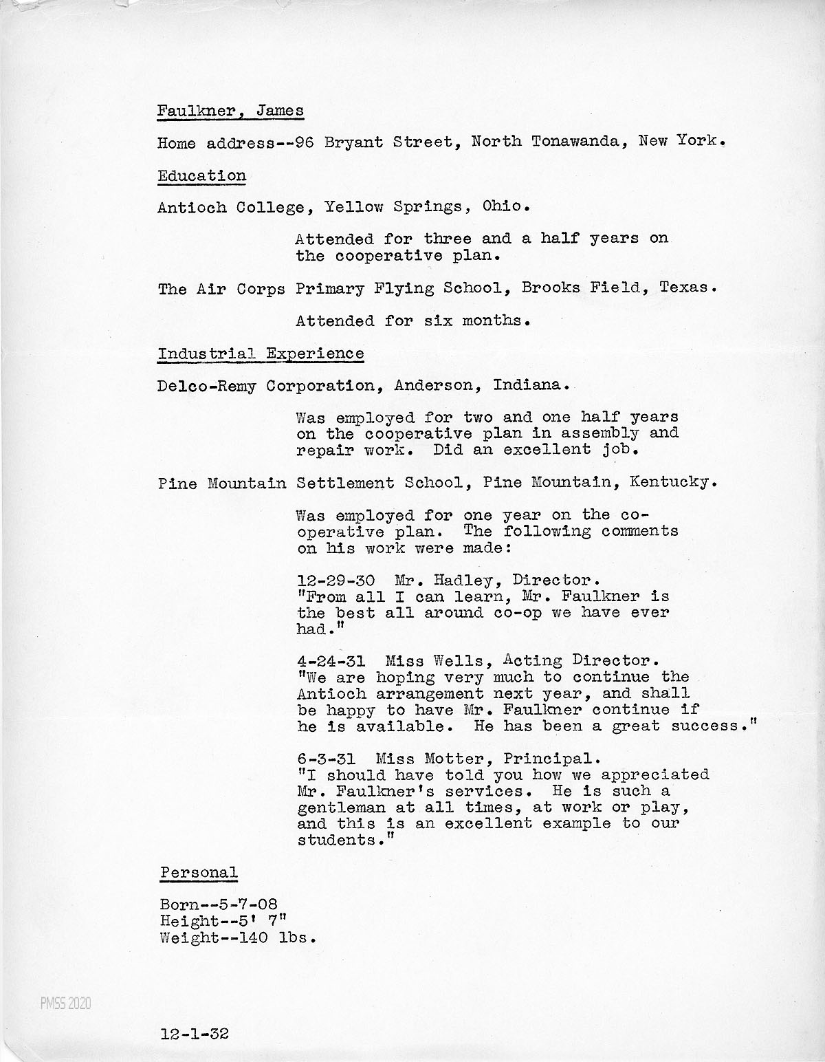 [001] December 1, 1932. Resume for “Faulkner, James,” showing his home address, education, industrial experience (including 1 year at PMSS in the Antioch College co-operative program), and personal (birthdate, height and weight).