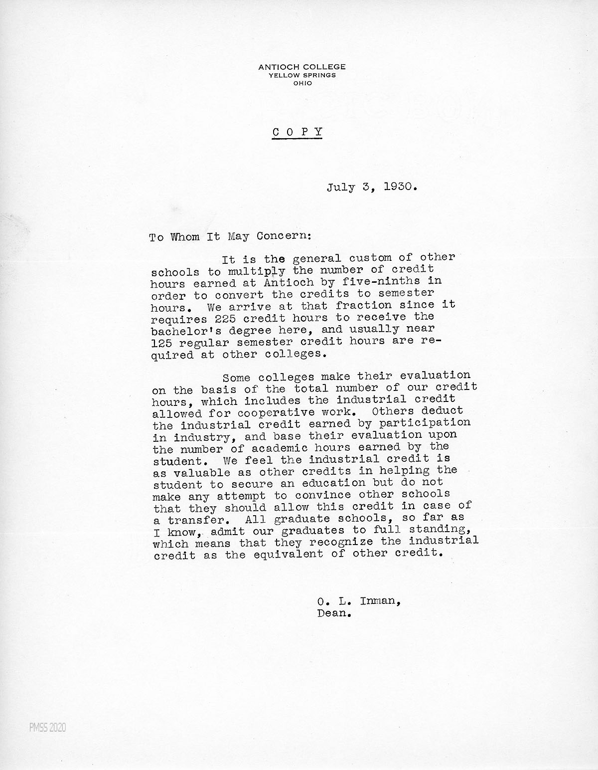[002] July 3, 1930. “To Whom It May Concern” from O.L. Inman, Dean, Antioch College, Yellow Springs, OH, who explains how Antioch’s credit hours are converted to semester hours by other colleges; and also whether other schools include Antioch’s industrial credits (which includes cooperative work) in the total number of credits.