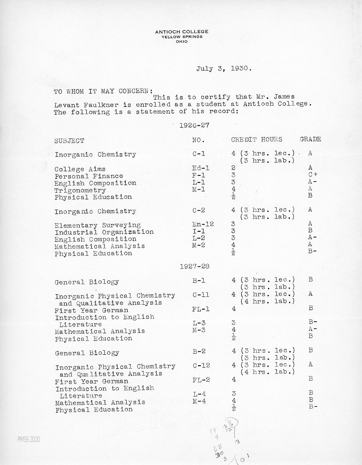[003] July 3, 1930. (Page 1) “To Whom It May Concern” on Antioch College letterhead, certifying that “Mr. James Levant Faulkner is enrolled as a student at Antioch College” and providing a transcript of his record for 1926-27 and 1927-28, showing Subject, No., Credit Hours, and Grade.