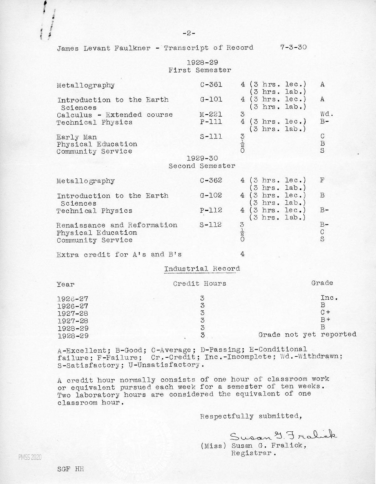 [004] July 3, 1930. Page 2 of Faulkner’s transcript of record for 1928-1929 (first semester), 1929-30 (second semester), and his Industrial Record for 1926-27 through 1928-1929. A “credit hour” is defined. Submitted by Miss Susan G. Fralick, Registrar.