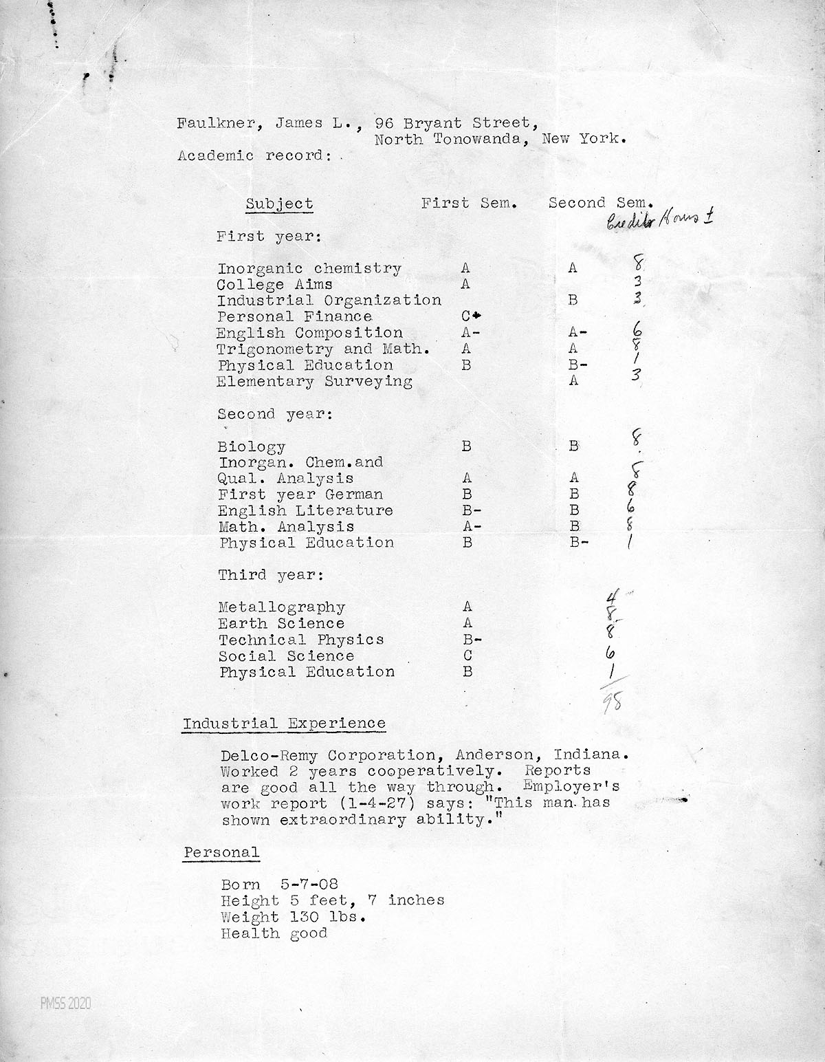 [005] N.D. Academic record for “Faulkner, James L.,” North Tonowanda, NY, listing subjects and grades for first, second and third years. A handwritten column for credit hours was added. Also provided are Industrial Experience and Personal (birth date, height, weight, health).