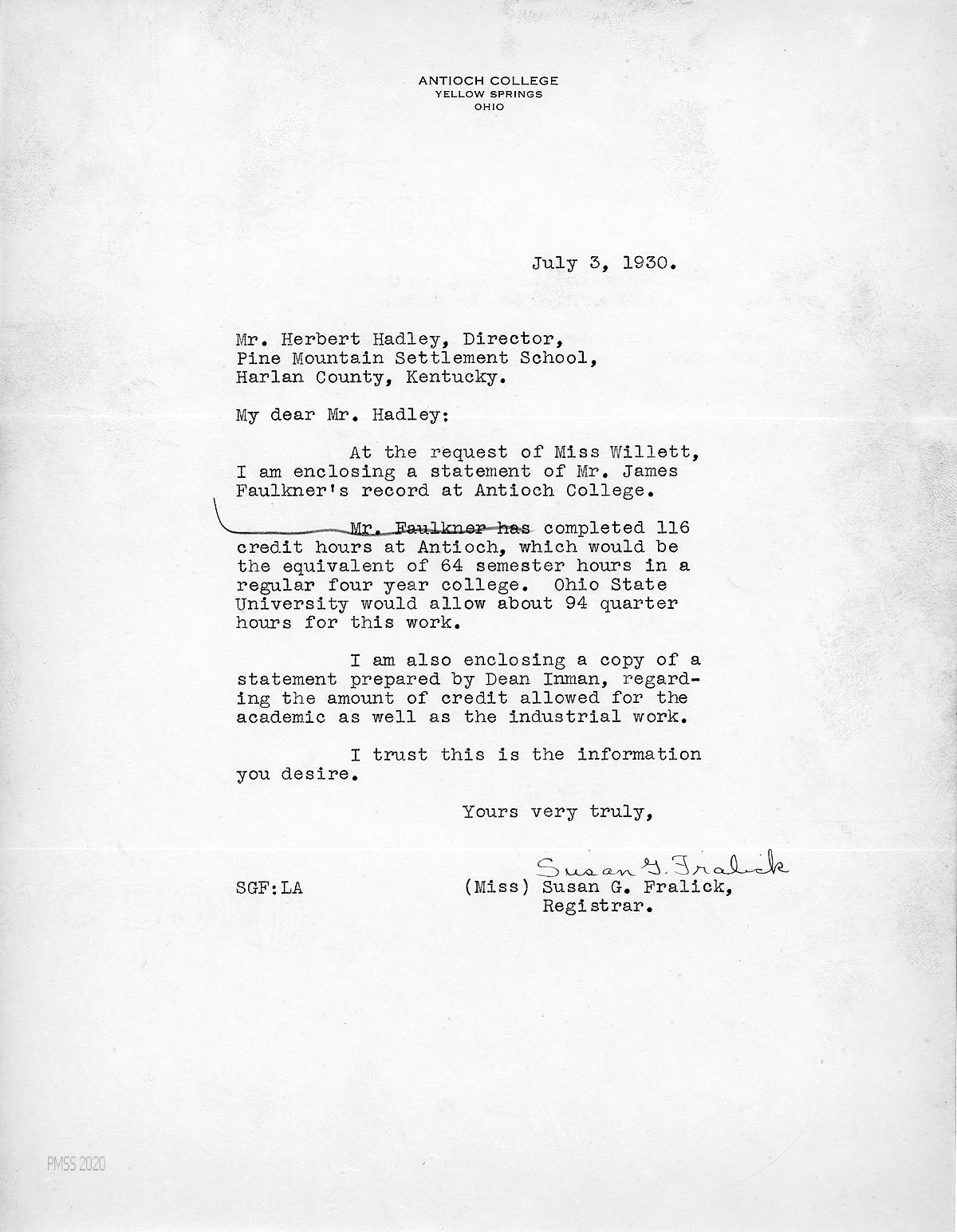 [006] July 3, 1930. To Hubert Hadley, PMSS Director, from Miss Susan G. Fralick, Registrar, on Antioch College letterhead. At Miss Willett’s request, she encloses Faulkner’s record at Antioch and Dean Inman’s statement regarding credits.