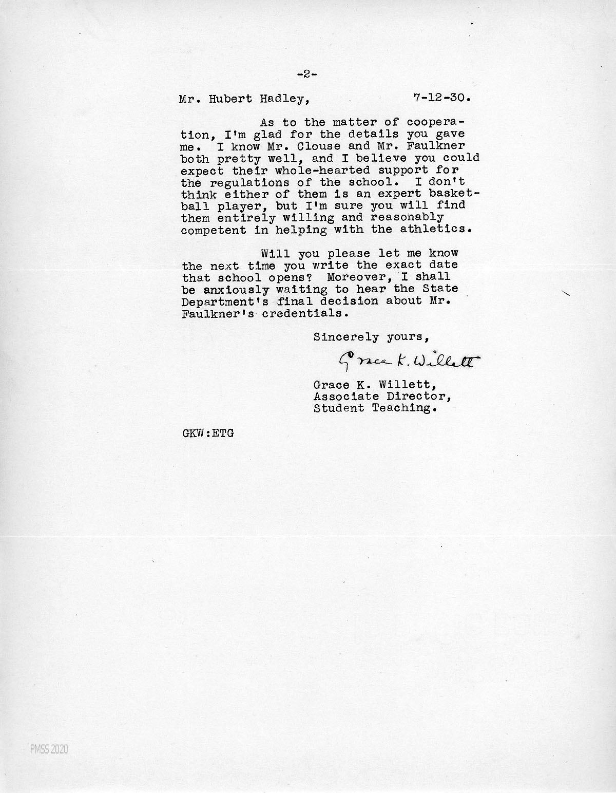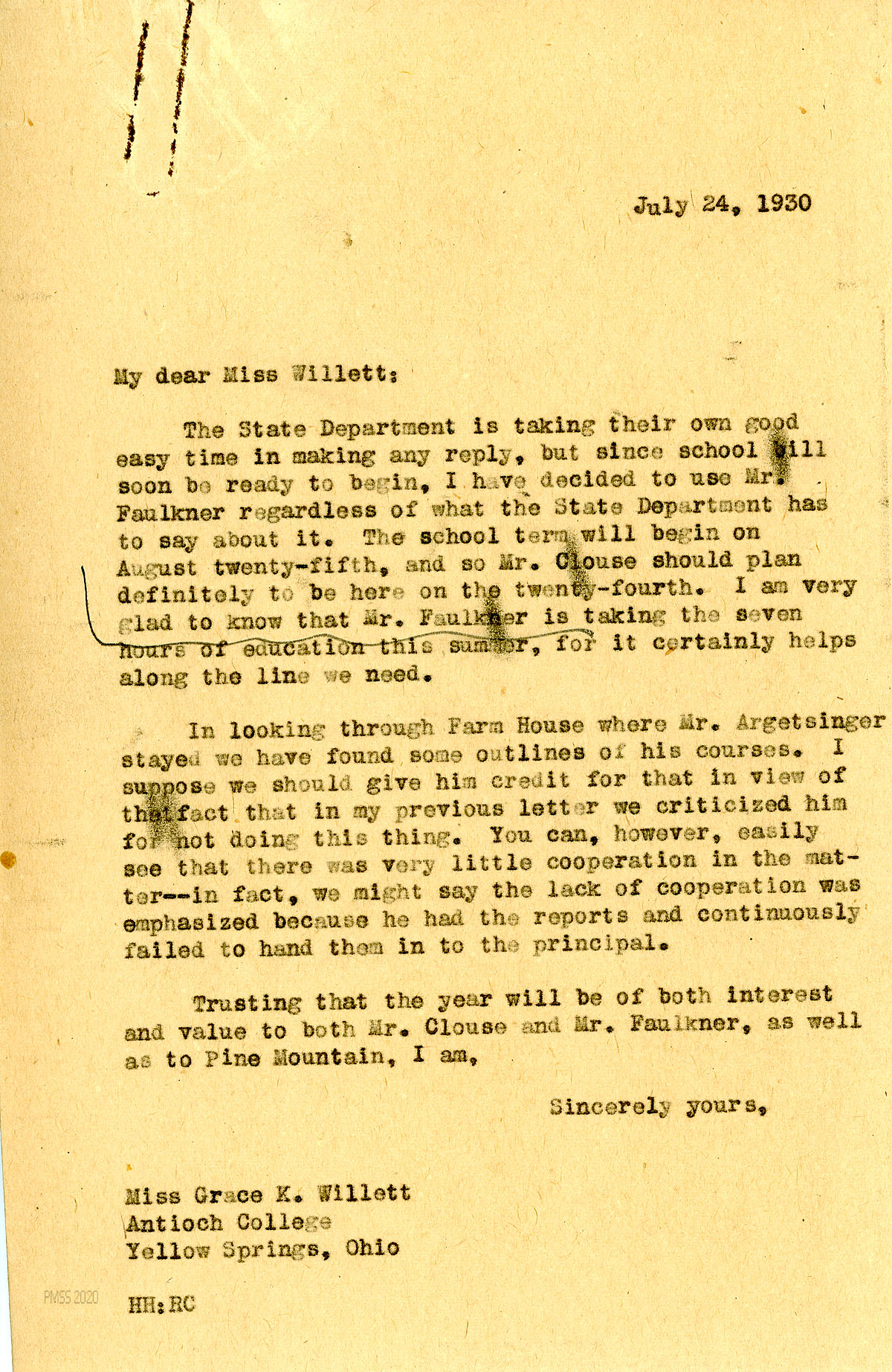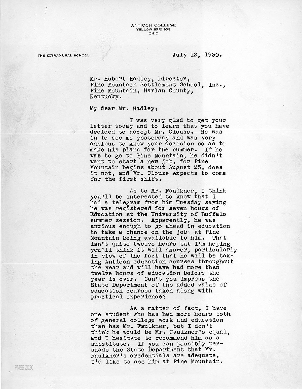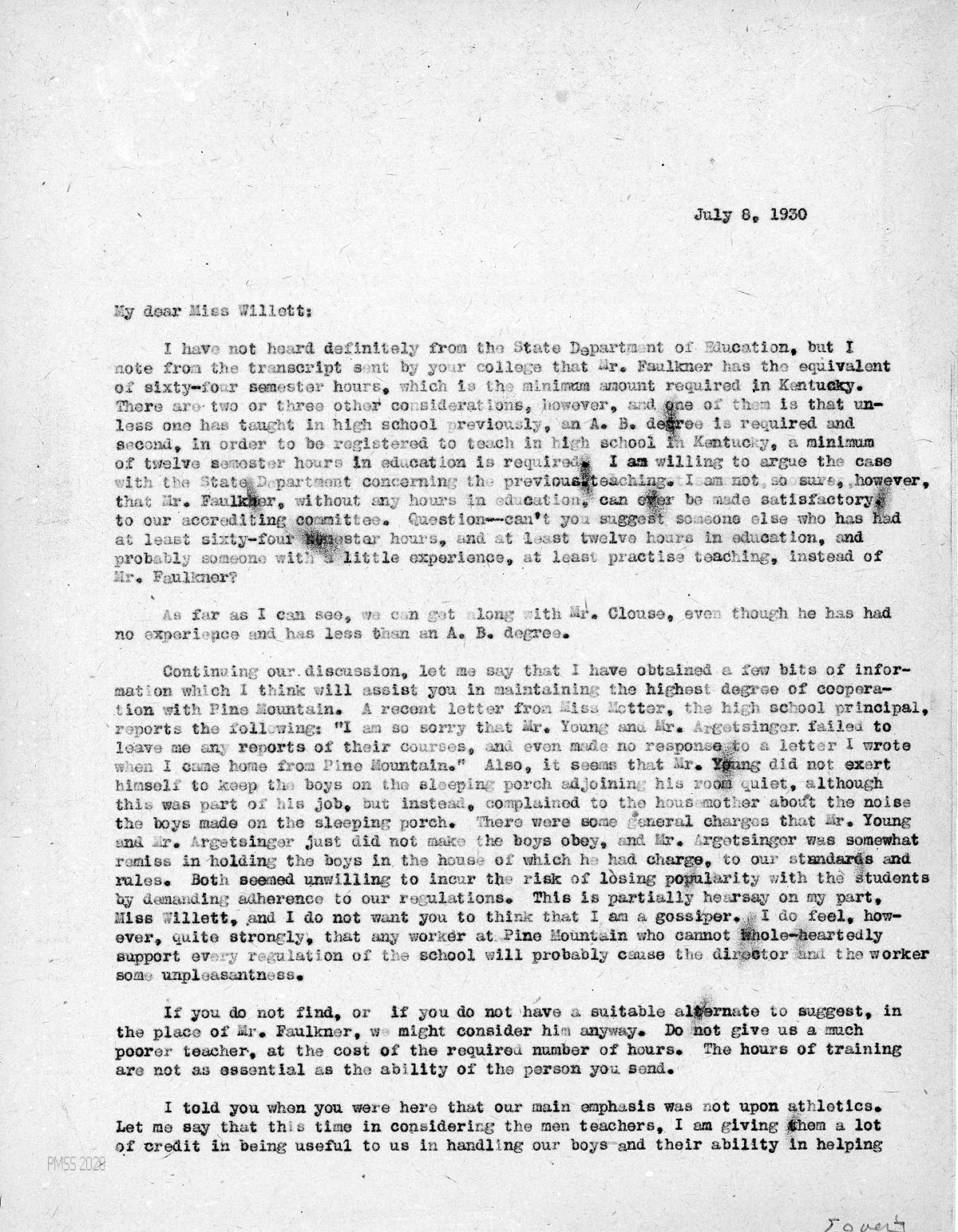 [007], [008] July 8, 1930. Two-page letter to Miss Grace K. Willett, Antioch College, from HH (Hadley), who asks her to suggest another candidate, as Faulkner’s credentials do not meet the State Department’s requirements to teach in high school in Kentucky. Mentions “we can get along with Mr. Clouse” although he doesn’t have the necessary credentials. He describes problems with Mr. [John Howard] Young and Mr. Argetsinger, who “seemed unwilling to incur the risk of losing popularity with the students by demanding adherence to our regulations.” Hadley states that “The hours of training are not as essential as the ability [in handling the students and helping with athletics] of the person you send.” Therefore, he will accept Faulkner if an alternative cannot be found.