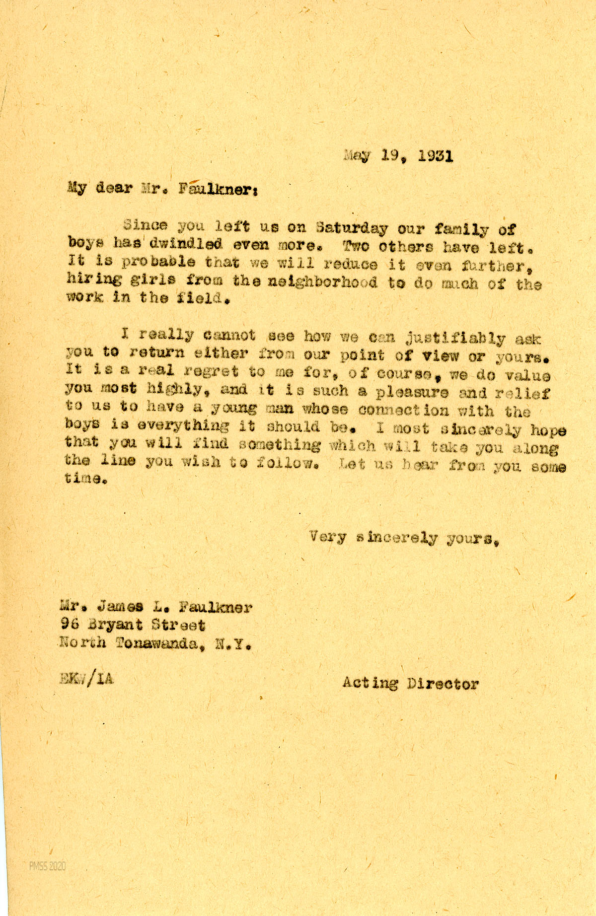 [013] May 19, 1931. To Faulkner in North Tonawanda, NY, from EKW (Evelyn K. Wells), Acting Director. “I really cannot see how we can justifiably ask you to return either from our point of view or yours. It is a real regret to me for, of course, we do value you most highly, and it is such a pleasure and relief to us to have a young man whose connection with the boys is everything it should be. I most sincerely hope that you will find something which will take you along the line you wish to follow. …”