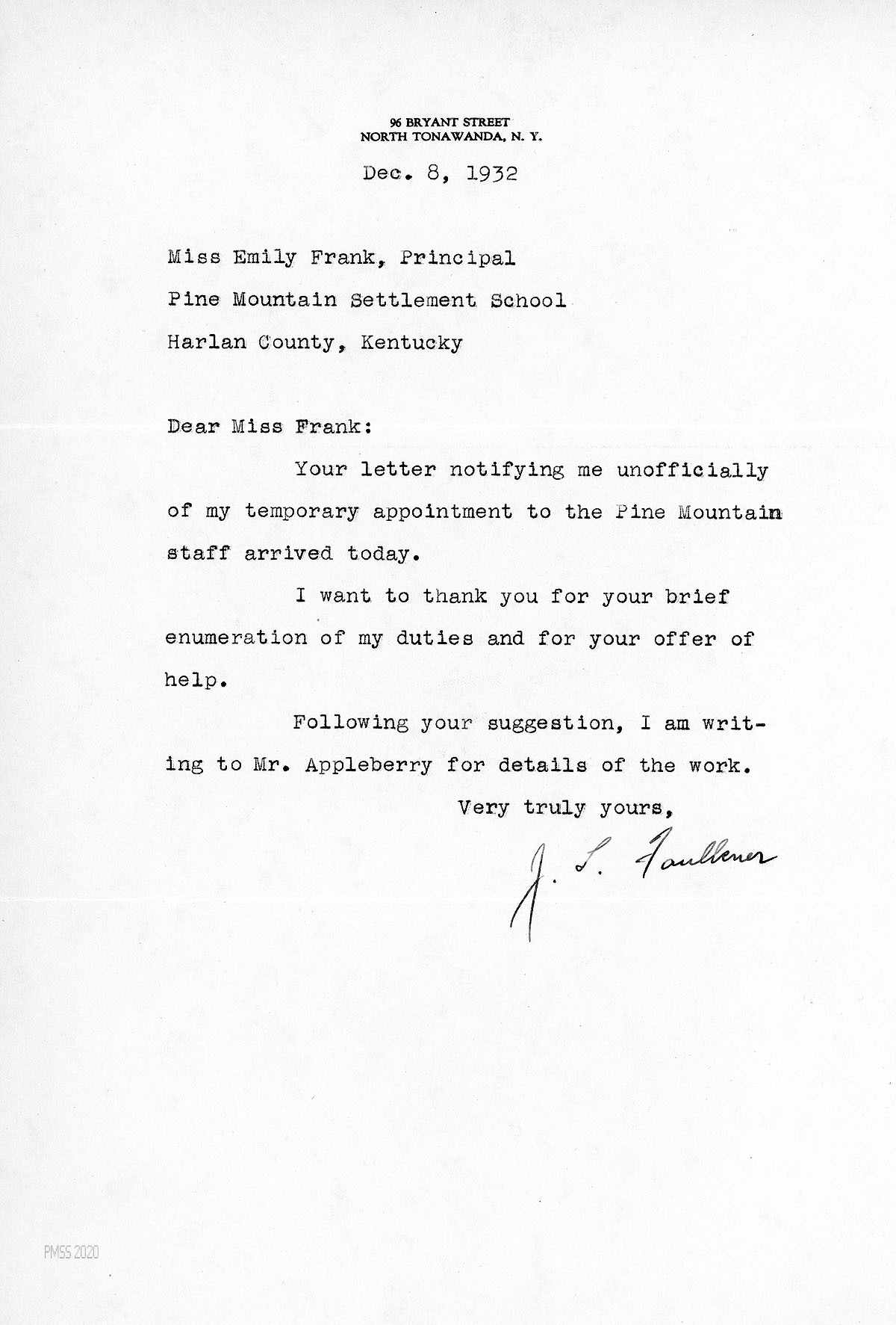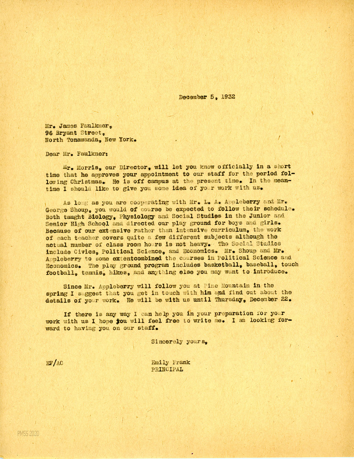[014] December 5, 1932. To Faulkner from Emily Frank, PMSS Principal, who tells him “Mr. [Glyn] Morris, our director, will let you know officially in a short time that he approves your appointment to our staff for the period following Christmas.” Miss Frank then describes the type of work he will be doing in cooperation with Mr. L. A. Appleberry and Mr. George Shoup, who taught Biology, Physiology, and Social Studies in Junior and Senior High School and directed playground activities. Suggests that Faulkner meet with Appleberry who will be following Faulkner.