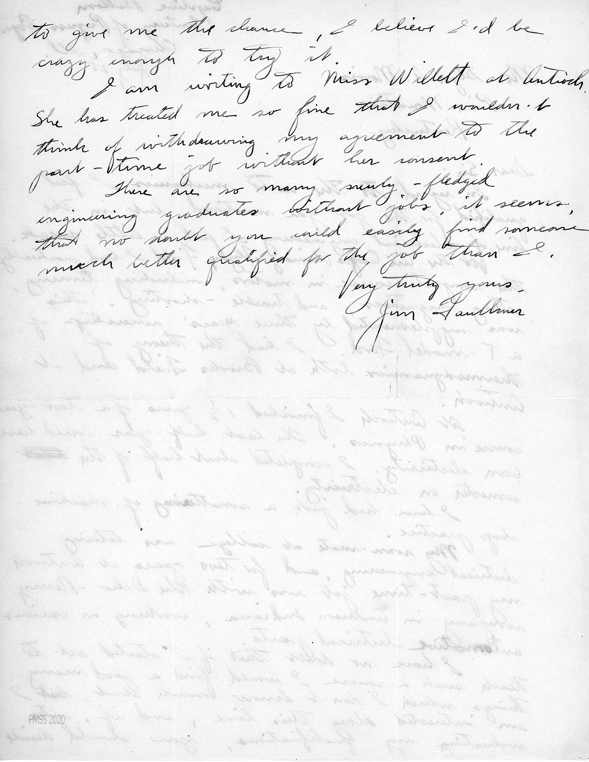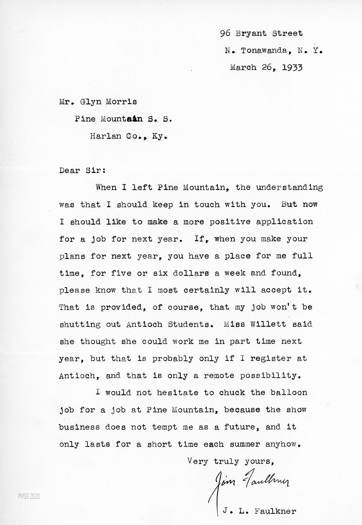 [016] March 26, 1933. To Glyn Morris from “Jim Faulkner,” N. Tonawanda, NY, applying for a PMSS position for 1934; full-time, $5 or $6 a week; will happily quit his summer “balloon job…because the show business does not tempt me as a future….”
