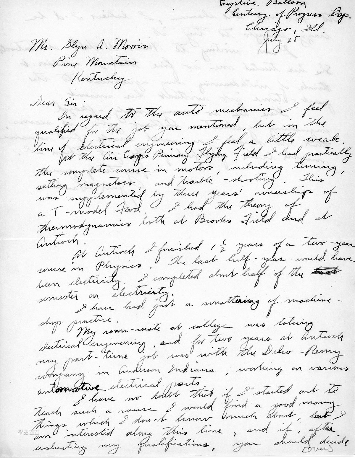 [017], [018] July 28, [no year]. Two-page handwritten letter to Morris from Faulkner at Captive Balloon, Century of Progress (?), Chicago, IL, who lists his qualifications for teaching auto mechanics and electrical engineering.