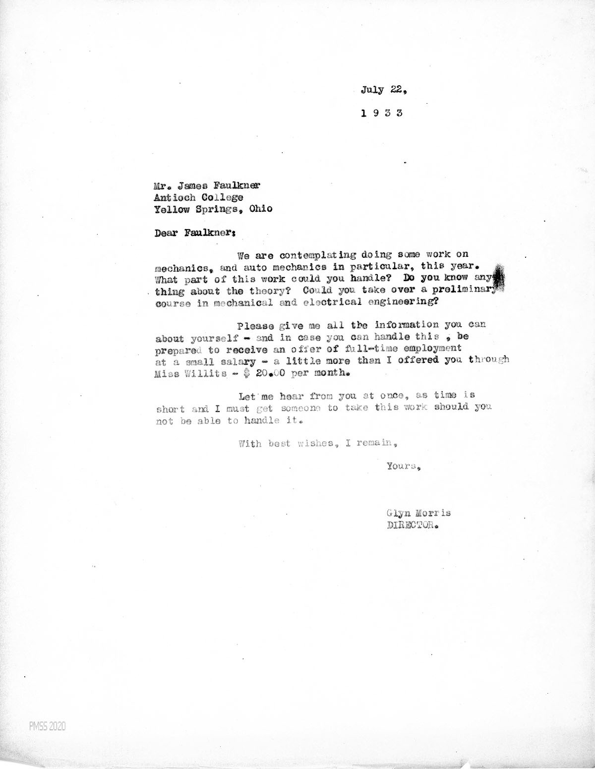 [019] July 22, 1933. To Faulkner at Antioch College, from Morris, who asks Faulkner what part of mechanics or auto mechanics can he handle; asks for information; can offer full-time employment at $20.00 a month.