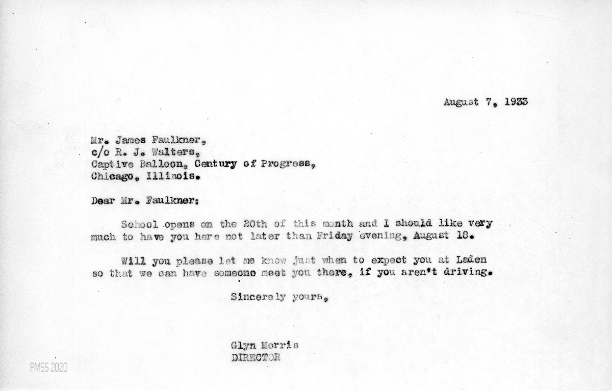 [020] August 7, 1933. To Faulkner in Chicago, IL, from Morris, informing him of the date that School opens and that he should arrive a day earlier.