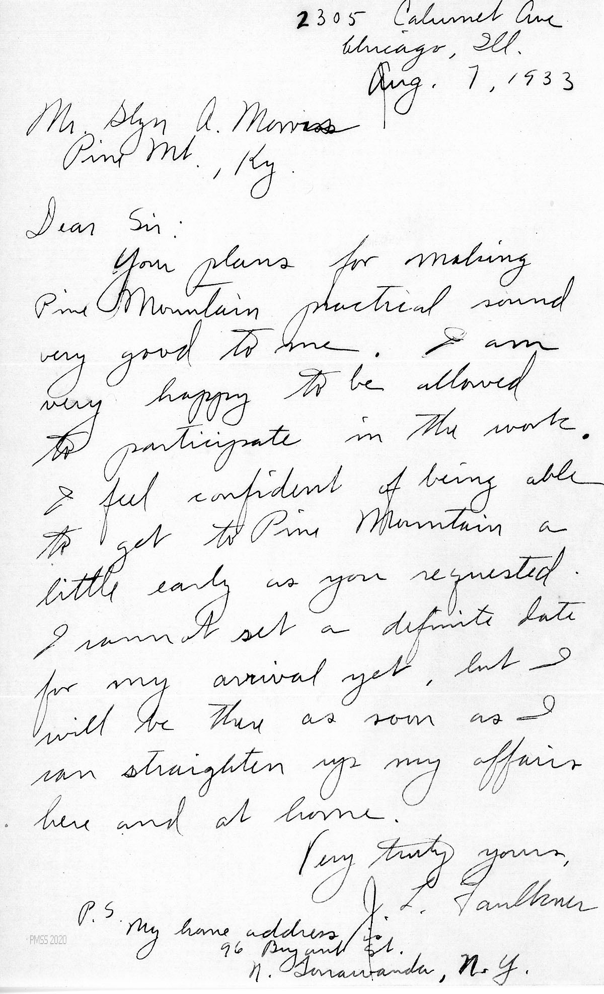 [021] August 7, 1933. Handwritten letter to Morris from Faulkner in Chicago, IL, who will arrive at PMSS on the day requested. Provides home address in N. Tonawanda, NY.