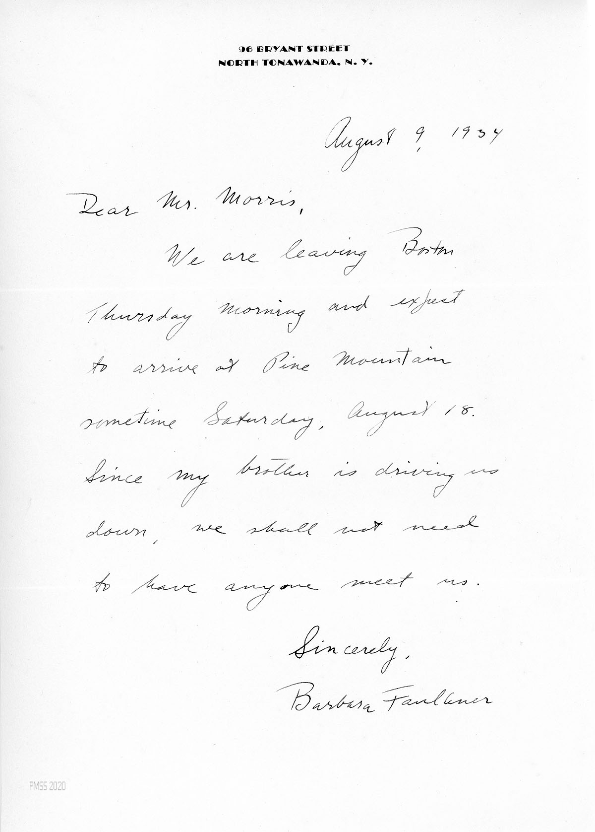 [022] August 9, 1934. Handwritten letter to Morris from Barbara Faulkner in N. Tonawanda, NY, informing Morris of their arrival date.
