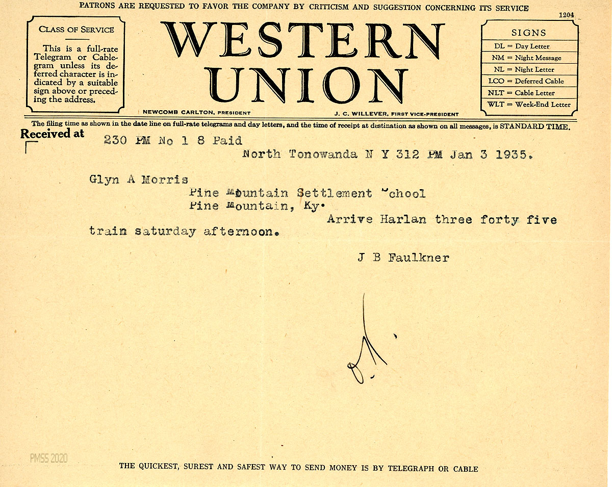 [023] January 3, 1935. Western Union telegram to Morris from Faulkner, stating arrival day and time by train.