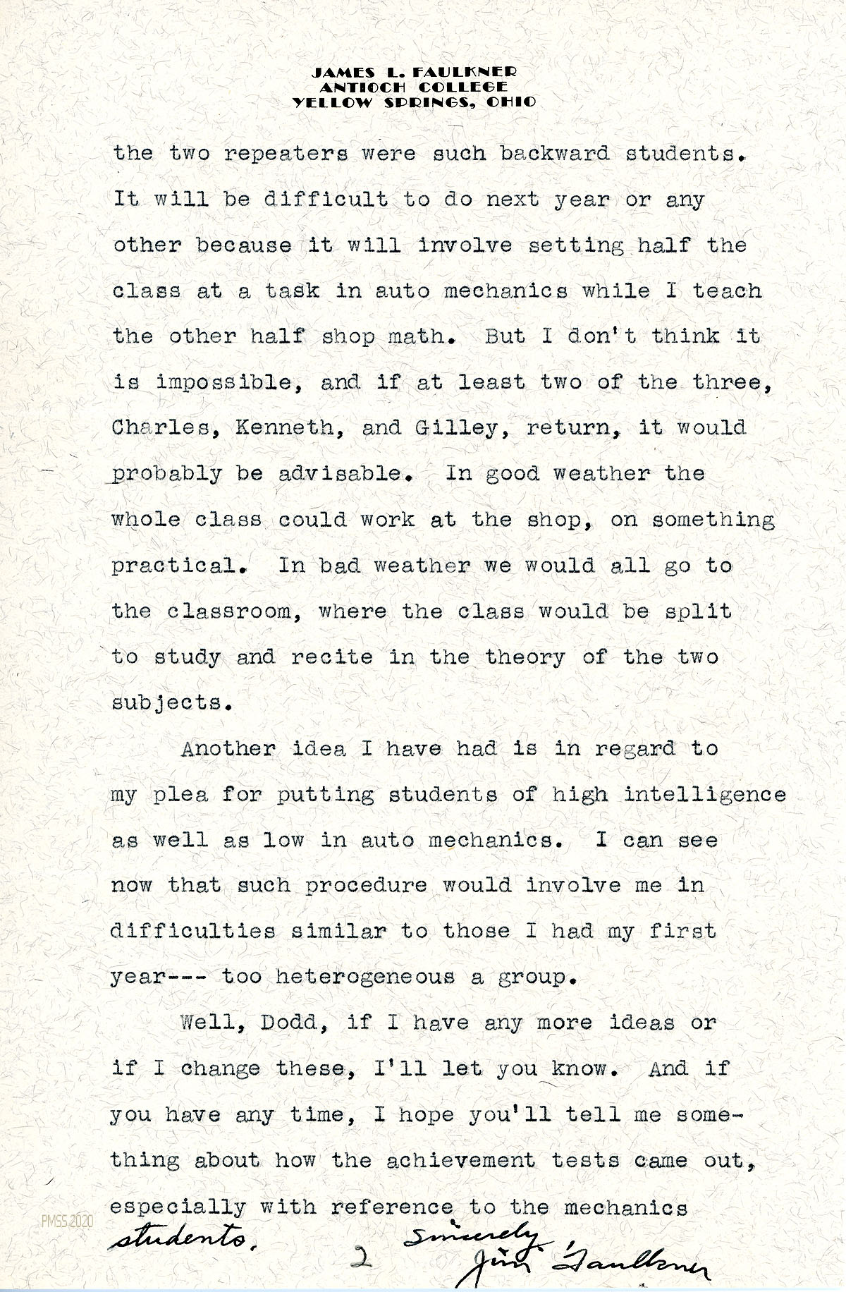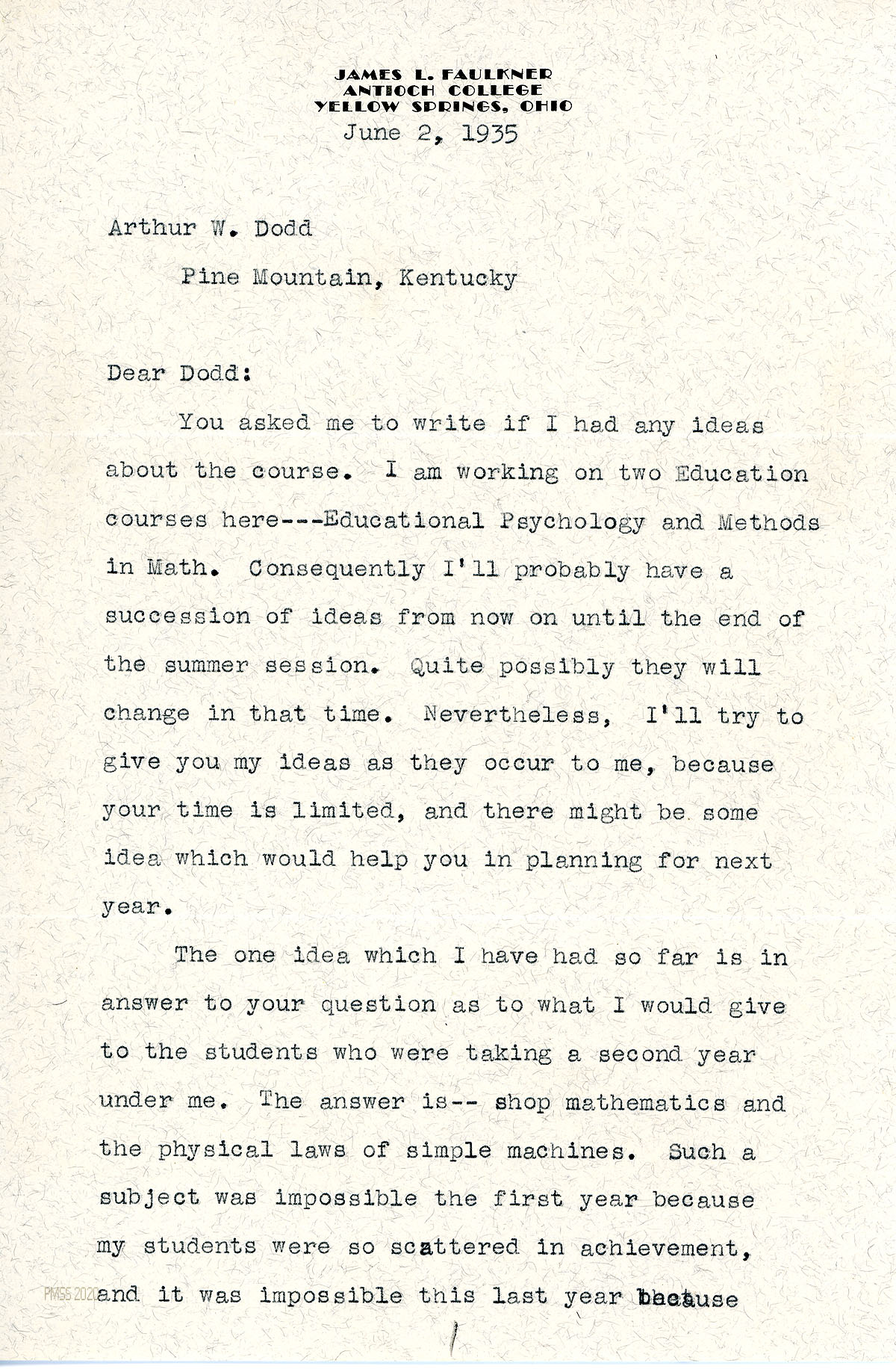 [024], [025] June 2, 1935. Two-page letter to Arthur W. Dodd, PMSS, from Faulkner at Antioch College, responding to Dodd’s request for ideas about Mechanics courses. Faulkner is currently working on two summer Education courses at Antioch: Educational Psychology and Methods in Math.