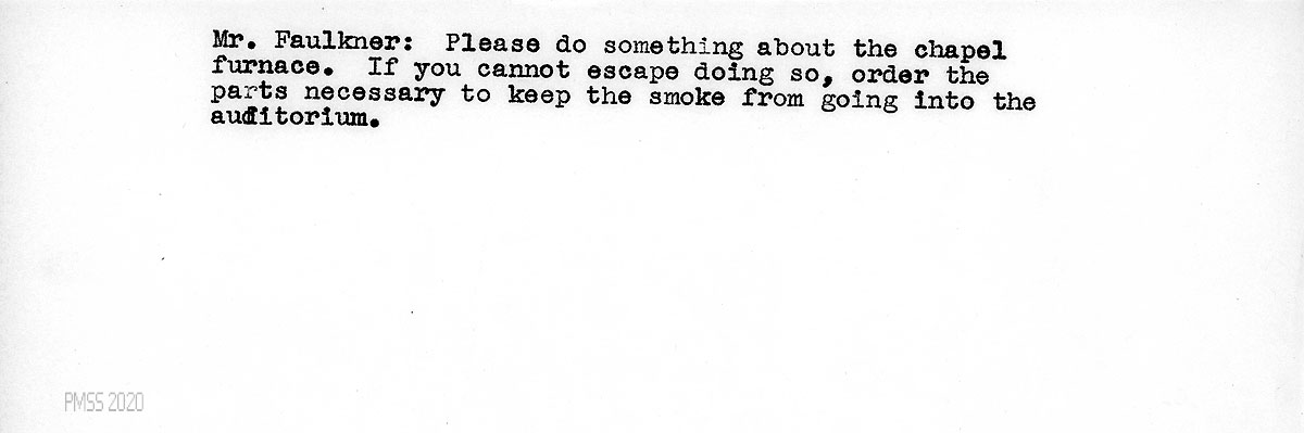 [027] [No date, unsigned]. A note to Faulkner, asking him to repair the chapel furnace “to keep the smoke from going into the auditorium.”