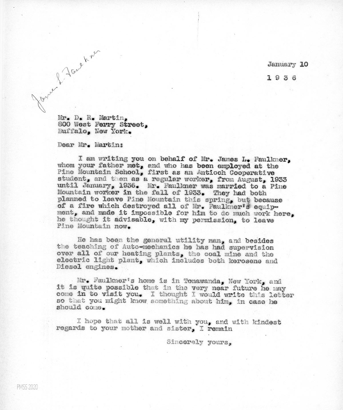 [030] January 10, 1936. To D.R. Martin in Buffalo, NY, from [unsigned], introducing him to Faulkner. Describes Faulkner’s PMSS employment, marriage to a PMSS worker. Faulkner must leave PMSS five months earlier than planned because a fire destroyed all his equipment. Since his home is in Tonawanda, NY, he may visit Martin.