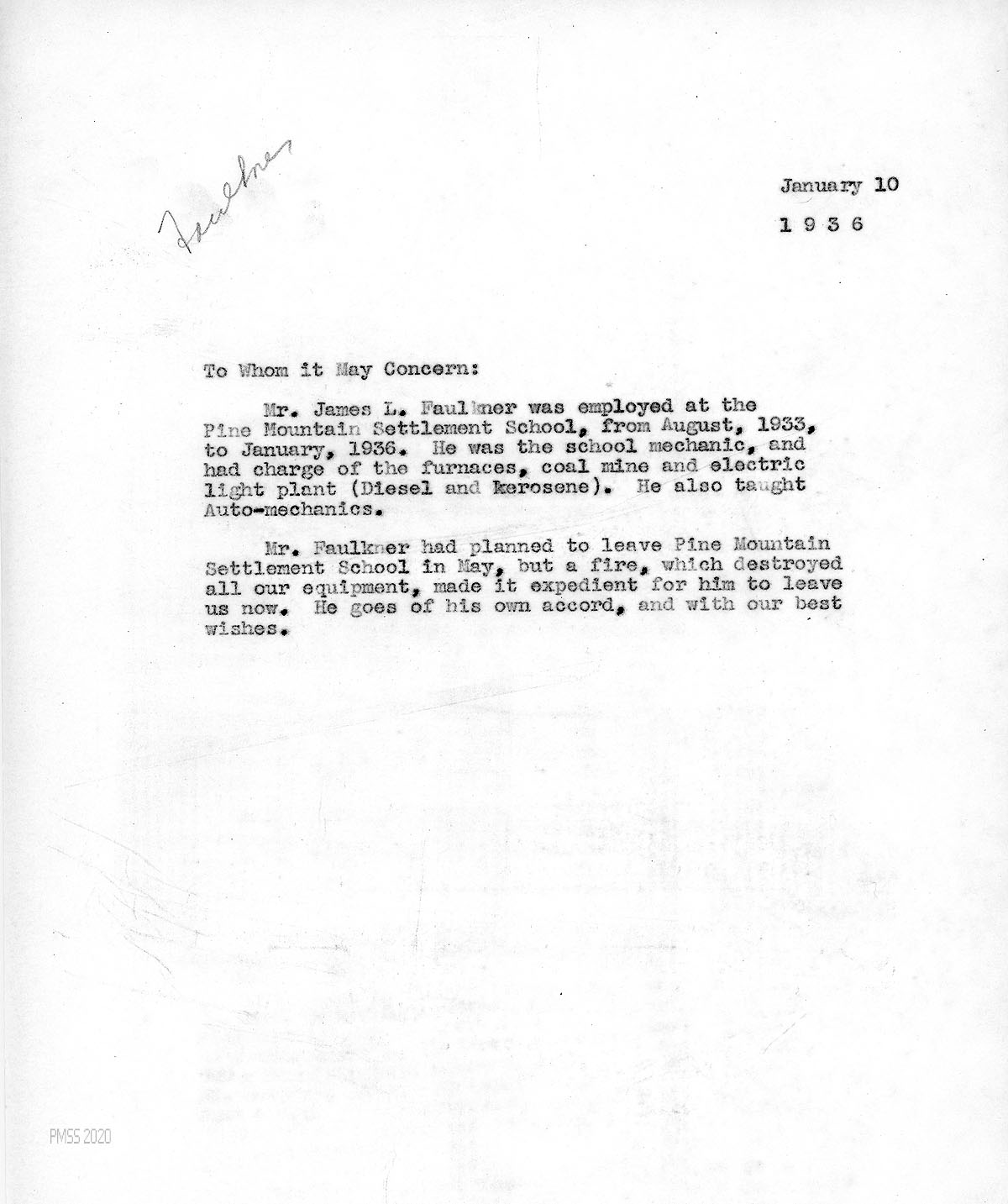 [031] January 10, 1936. “To Whom It May Concern” from [unsigned]. Letter of reference for Faulkner confirming his PMSS employment and duties; that he left PMSS on his own accord due to a fire that destroyed all his equipment.