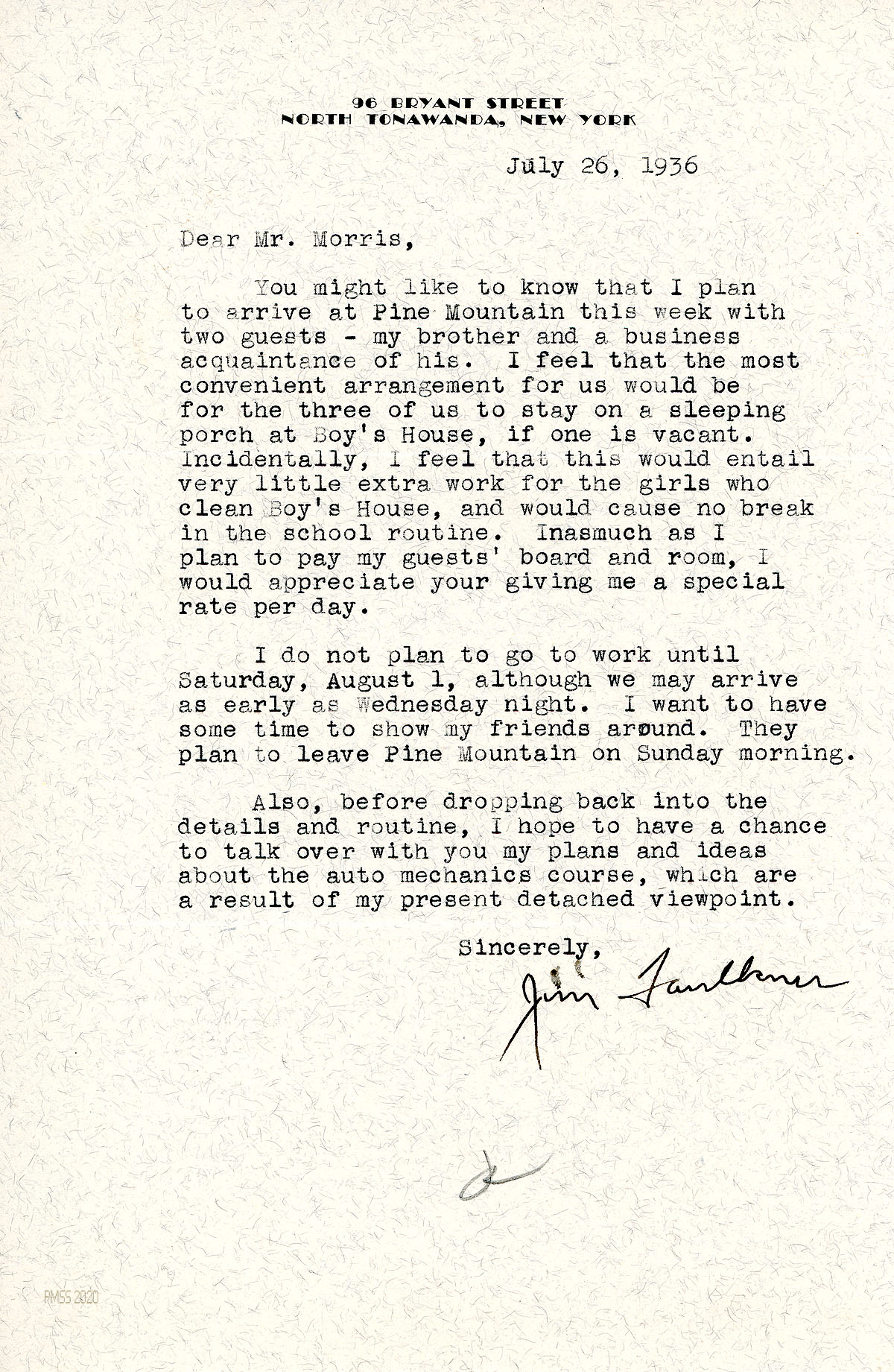 [032] July 26, 1936. To Morris from Faulkner, who is arriving at Pine Mountain “with two guests – his brother and a business acquaintance of his.” He will begin work on Saturday, August 1; has new ideas for the auto mechanics course.