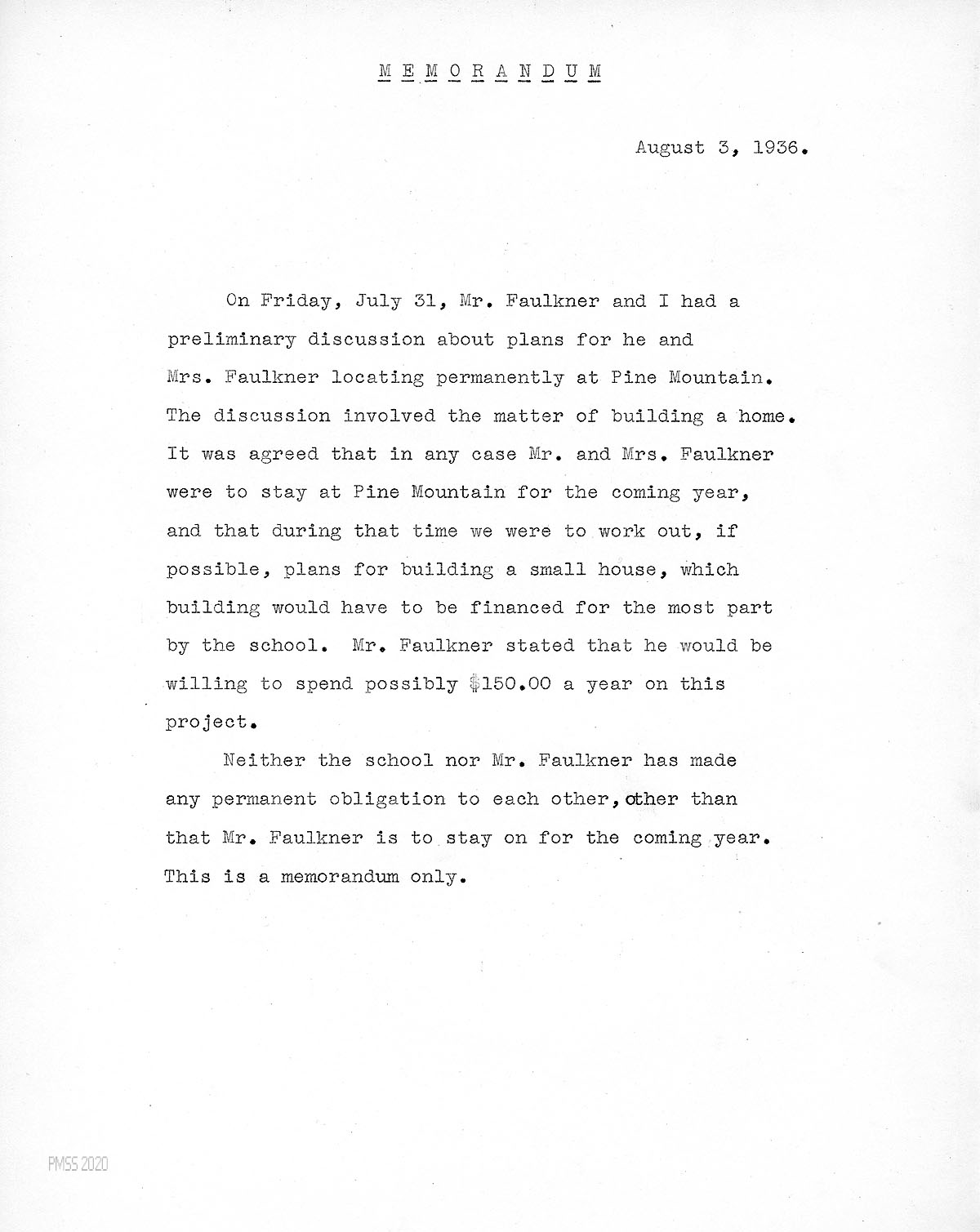 [033] August 3, 1936. Unsigned Memorandum, recording a “preliminary discussion” between Faulkner and [unsigned, likely Morris] for Faulkner and his wife to build a home on campus and live permanently at Pine Mountain, financed mostly by the School and by Faulkner at about $150 a year. The two did agree that Faulkner is to stay at Pine Mountain for the coming year.